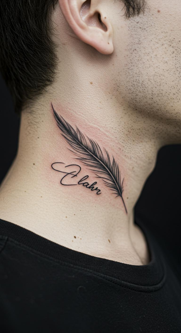 Feathers or birds hide names well. They blend over letters smoothly. Practice drawing feathers at home. It costs nothing extra. Choose your neck for a bold spot. These designs are simple, lowering fees. Focus on flowing lines. Split the idea into parts. Free sketches online guide you. It’s an easy home prep. Folks appreciate the disguise. Add a personal bird type. Real advice: use paper to test flow. This method conceals neatly.