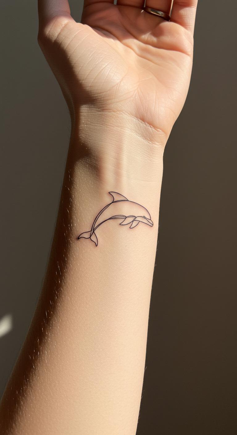 A single-line dolphin on the wrist keeps things straightforward and chic. Think of it as a quick sketch that says a lot with little effort. You get a symbol of freedom that fits daily life. Start by picking a local artist who offers small designs for under $50. Sketch your own version on paper first, using a pen to mimic the line. This helps you visualize it before committing. Choose black ink for longevity. Keep costs down by avoiding extras. After getting it, protect the area with basic lotion from your bathroom cabinet. Many folks pair this with simple jewelry to enhance the look. Try drawing similar lines on your hand with a temporary marker as a test run. It’s an affordable way to see if it suits you. Remember, small tattoos heal faster, so daily care like washing with soap means less hassle.