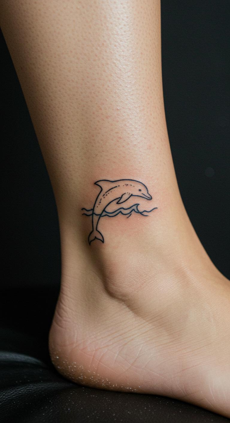 Add waves to your dolphin on the ankle for a nod to the ocean. This design turns a simple idea into a story of adventure. It fits neatly under socks or shoes for work. Find an artist online who specializes in small pieces; sessions often cost around $40. Draw waves yourself on paper to guide the artist. Use free apps on your phone to experiment with layouts. Stick to basic black ink to keep it timeless. Cover it with sunscreen during beach days using items you already own. People love this for its discreet vibe. Test it by drawing on your skin with washable ink from a craft store. Easy steps like these make tattooing approachable. Focus on spots that show off the design when you want, like summer outings.