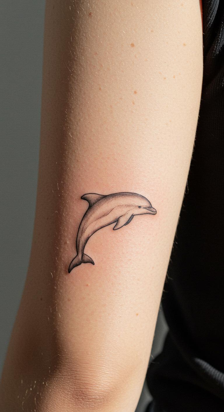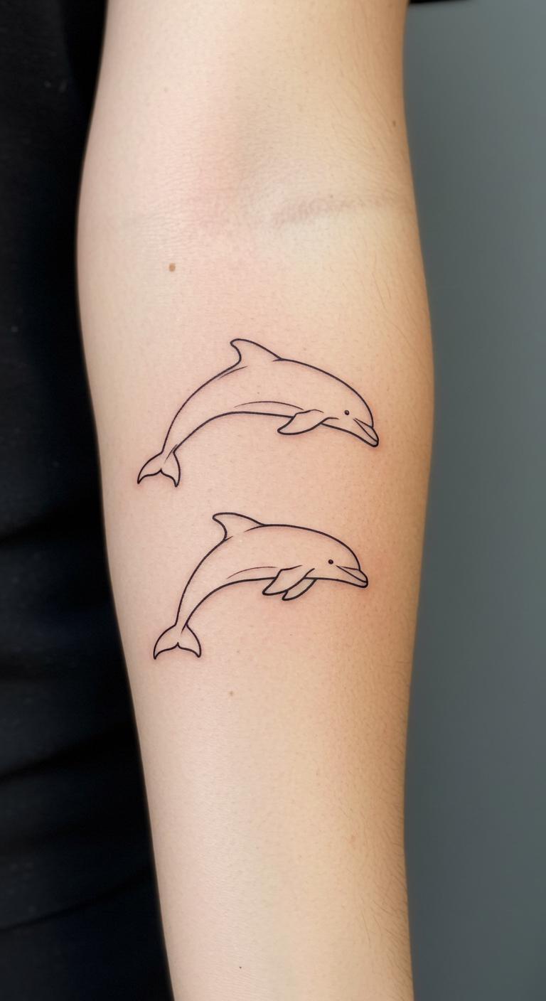 Pair two dolphins on the forearm for a sense of unity and play. It’s a straightforward way to double the fun without clutter. This placement lets you show it off or cover it up. Search for deals at walk-in studios; expect to pay about $60 total. Draw two simple outlines at home to plan it. Use a free drawing app to align them perfectly. Go with plain black for easy maintenance. Keep it safe with everyday sunscreen. Many appreciate this for family symbols. Test the idea with temporary tattoos from online stores. Quick actions like these save money and time. The design stays sharp with regular lotion use.