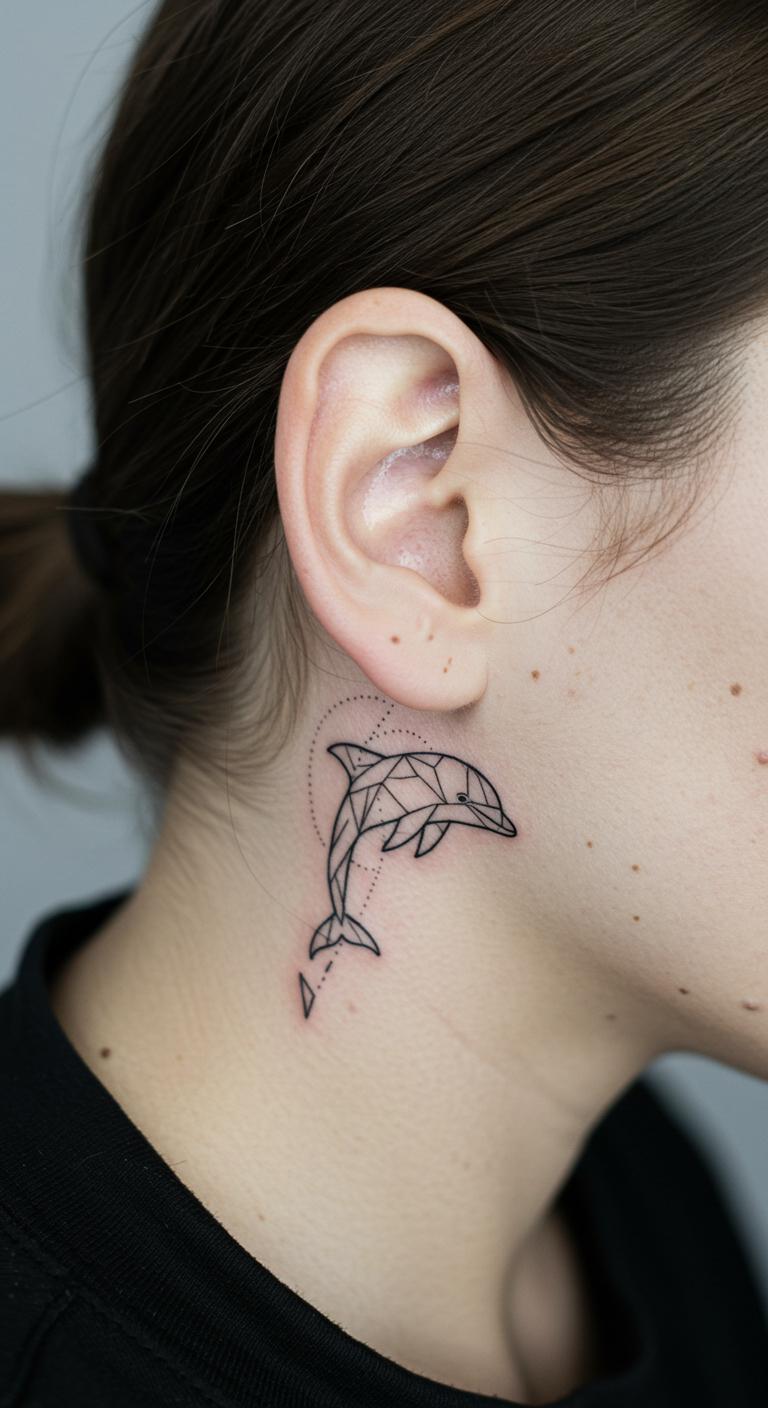 Geometric shapes around a dolphin behind the ear add a modern twist. It’s like turning a symbol into a piece of art that hides easily. This spot works for anyone wanting subtlety. Look for budget artists at local shops; prices start at $30. Sketch triangles or circles around a dolphin doodle at home. Use a ruler and pencil for accuracy. Opt for thin lines to maintain the minimalist feel. Protect it with a scarf or hat on sunny days. Folks often choose this for its personal touch. Practice by drawing on paper and holding it up to a mirror. Simple tools from your desk keep things affordable. This design heals quickly, so basic care like moisturizing helps it last.
