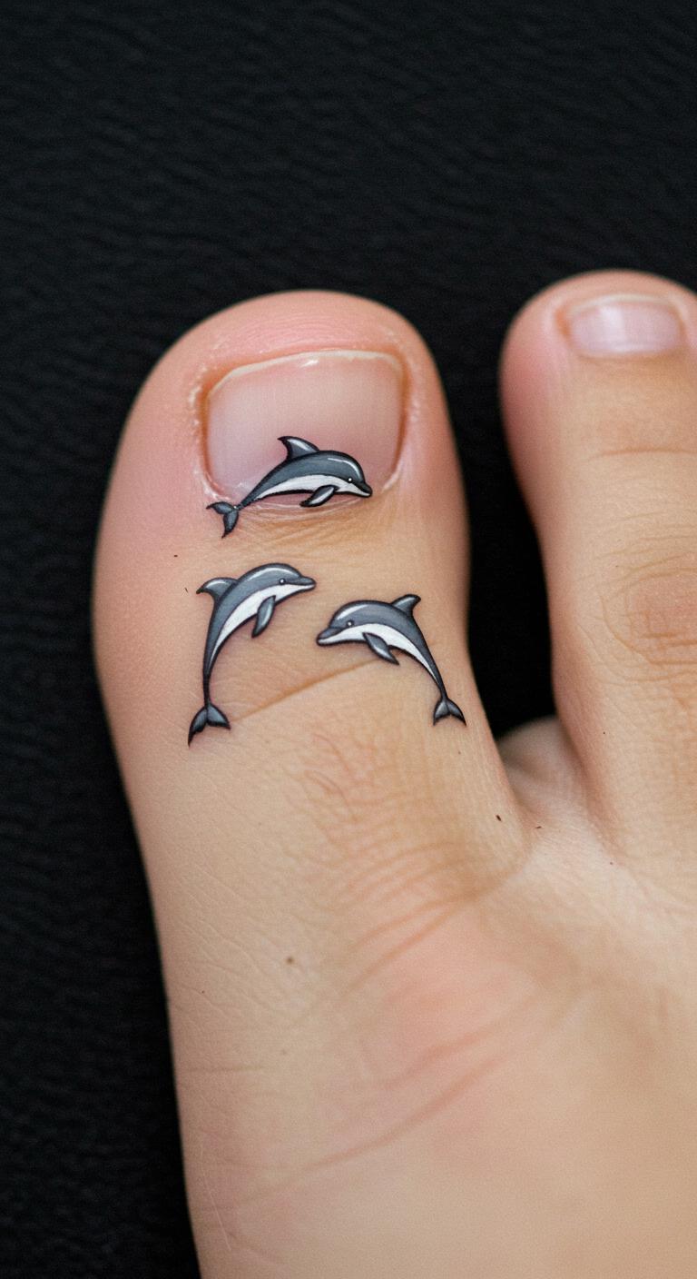 A trio of tiny dolphins on the toe is discreet. It’s perfect for sandals. Look for toe tattoos at $20. Draw the trio. Use fine pens. Keep small. Care with shoes. People enjoy the set. Test with ink.