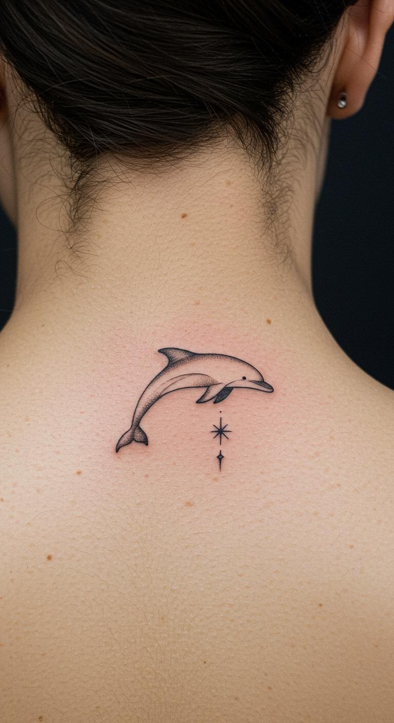 Combine a dolphin with a star on the neck for a celestial touch. This design mixes ocean themes with sky vibes seamlessly. It’s easy to conceal under hair. Seek out neck tattoo deals; prices around $40 work. Draw stars next to your dolphin sketch at home. A basic pencil does the trick. Use black ink for timelessness. Shield it with a collar or sunblock. Many choose this for personal milestones. Practice with washable pens on your neck. These methods keep costs low. Simple daily care ensures it fades less.