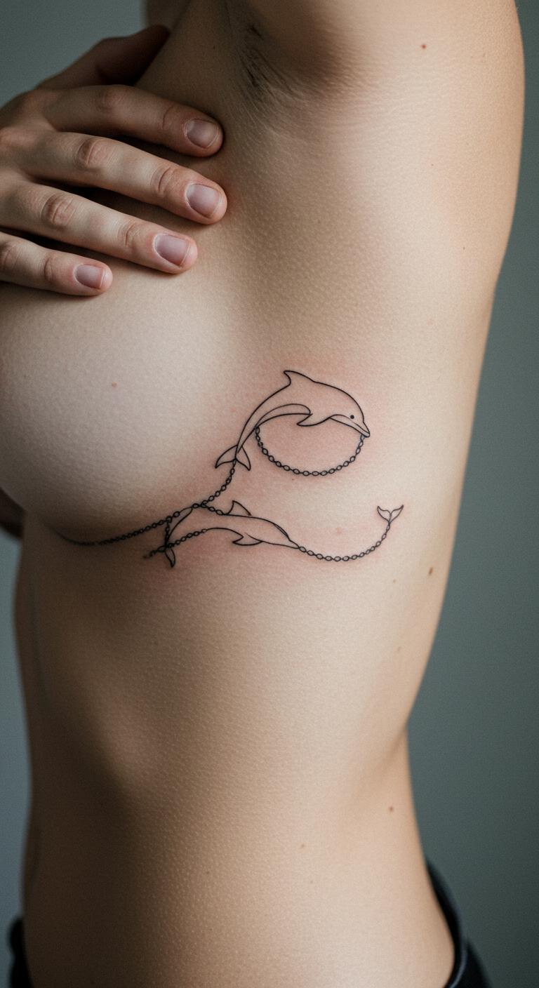 A chain of mini dolphins on the rib creates a flowing pattern. It’s a subtle choice that follows your body’s shape. This area is ideal for those who prefer private ink. Check for rib tattoo promotions; expect $50 or so. Sketch a chain link at home for planning. Paper and a marker are all you need. Opt for thin lines to keep it light. Protect it with loose clothing. People like this for its story-like quality. Test it by drawing on paper and taping it on. Easy, budget steps guide you through.