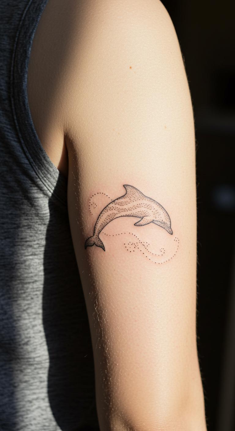Wave dots around a dolphin on the upper arm add a dotted pattern for flair. It’s a minimalist way to incorporate movement. This spot works well for sleeves or solo pieces. Look for arm tattoo options under $50. Sketch dots along waves in your design. A pen at home suffices. Choose simple ink colors. Guard it with sunscreen from your bag. Folks appreciate this for its dynamic feel. Try dotting paper designs as practice. Quick, cheap methods help you prepare.