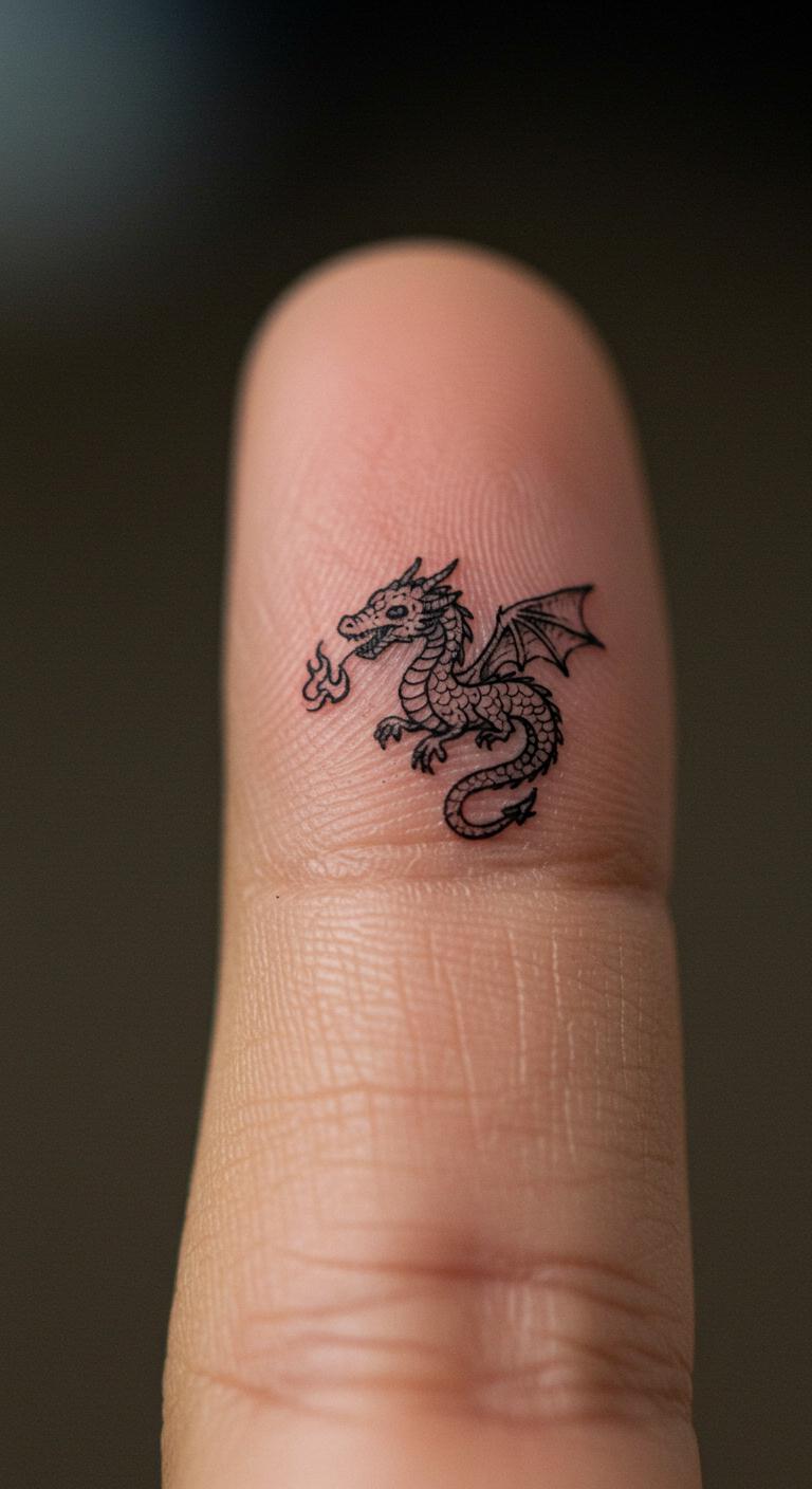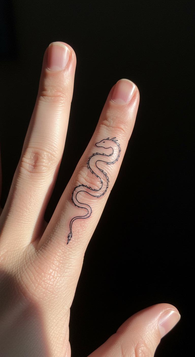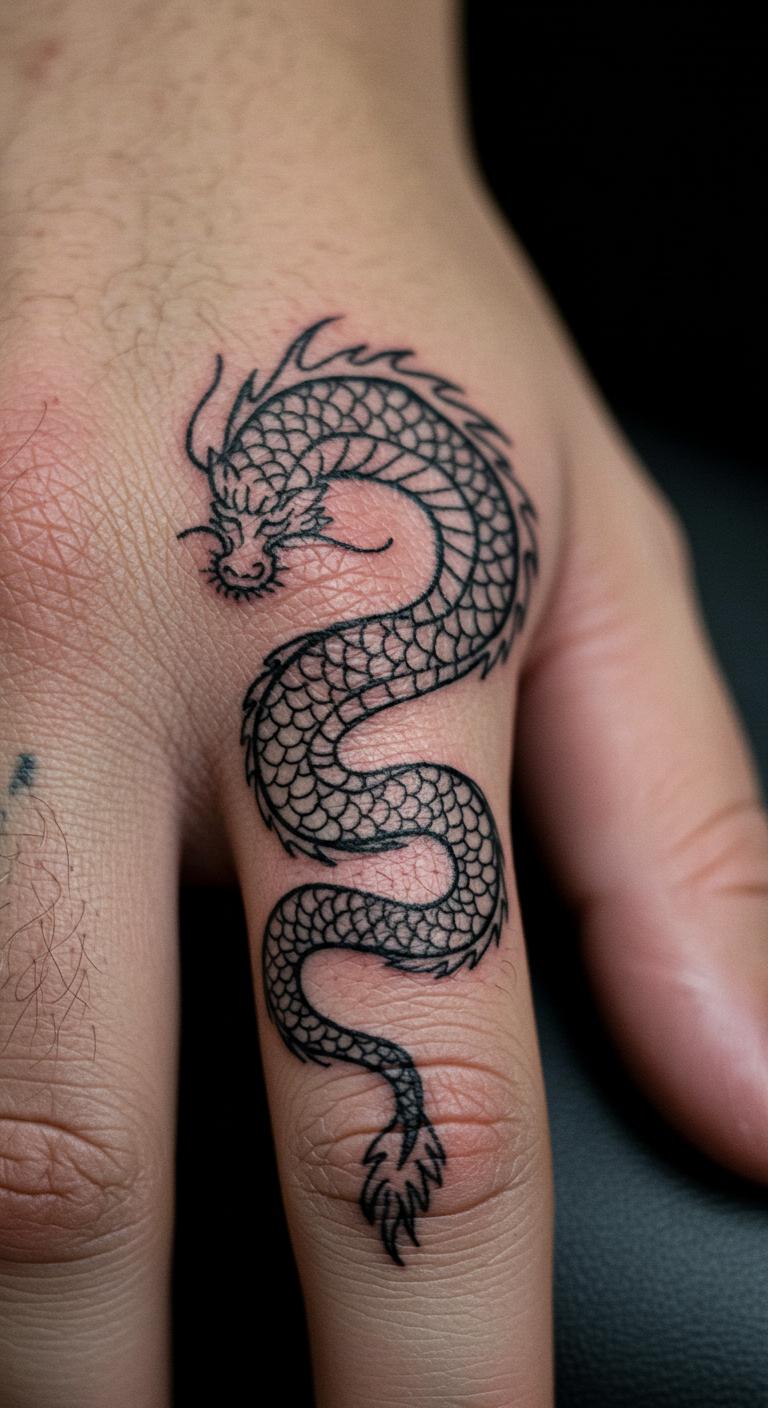 A simple dragon on your finger keeps things subtle and bold at once. Picture a tiny coiled shape in black ink that wraps around the digit. This design fits daily life without much fuss. Start by drawing a basic sketch at home using a pen and paper. Add your twist, like a slight tail curve. For budget tips, use free apps like Inkbox for temporary versions before committing. Real DIY: Trace a design online onto transfer paper for under $10. When ready, visit a local artist; sessions cost $50-80 for small pieces. Keep it black ink to save on color fees. This spot lets you show confidence openly or hide it quick. Choose a design that feels personal. Pain is minimal here, so it’s beginner-friendly. End result: A constant reminder of your strength. Mix it with daily jewelry for extra flair. Overall, it’s an affordable way to start your tattoo journey.
