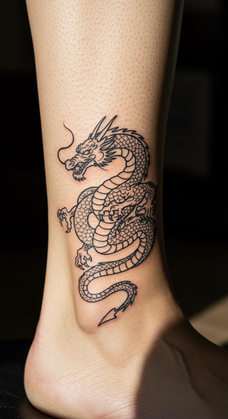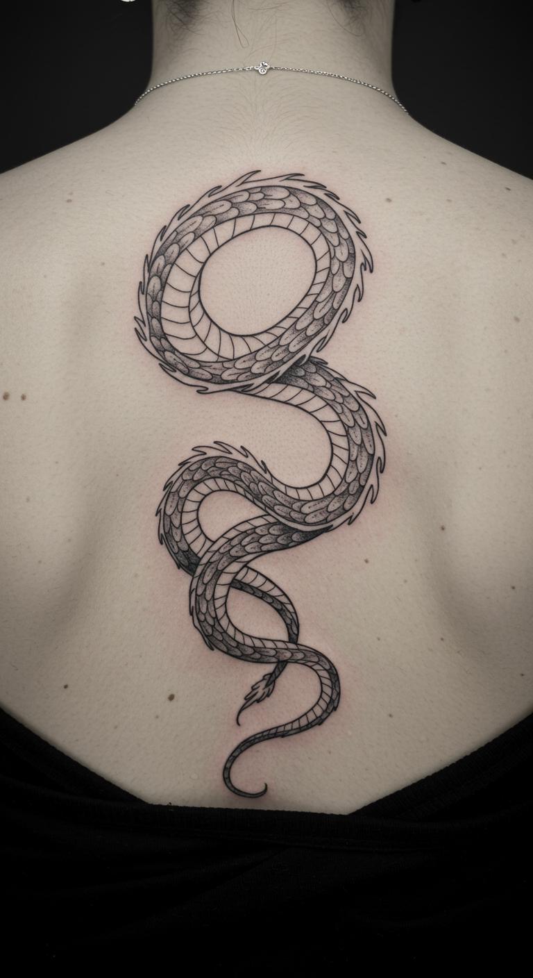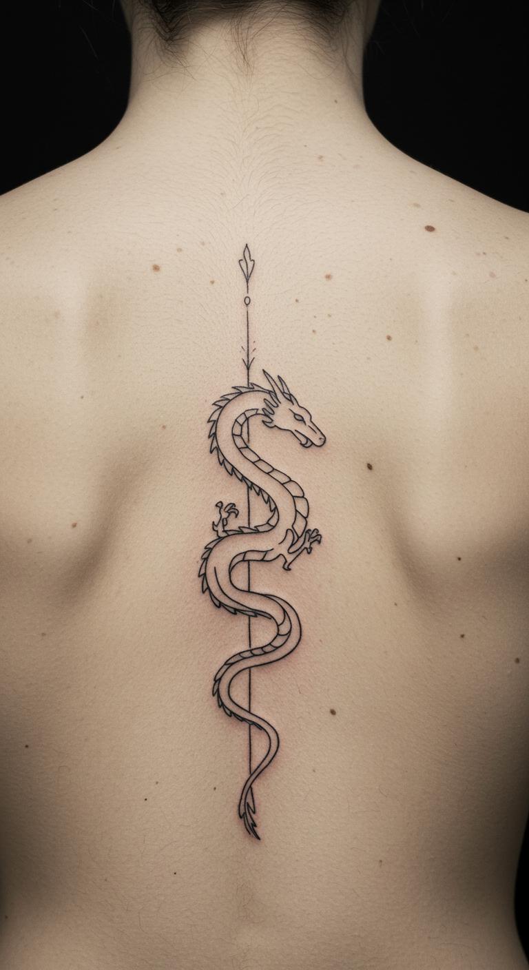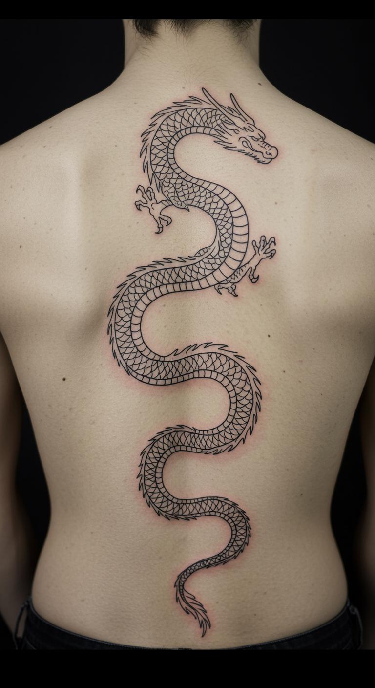 A spine dragon represents inner strength, running down your back in elegant lines. Envision a linear design that follows your body’s curve for a seamless look. It’s a private yet powerful spot. Draw a straight template on paper at home to plan it. Budget hack: Find free dragon stencils online and print them. For the tattoo, local shops charge $150-250; ask for minimal shading to cut expenses. DIY practice: Use henna kits for a temporary version at $5-10. This placement boosts confidence in fitted clothes. Add a small head detail for personalization. Aftercare is easy with daily moisturizing. Keep it hidden under shirts for work. In essence, it’s a subtle way to carry your power.