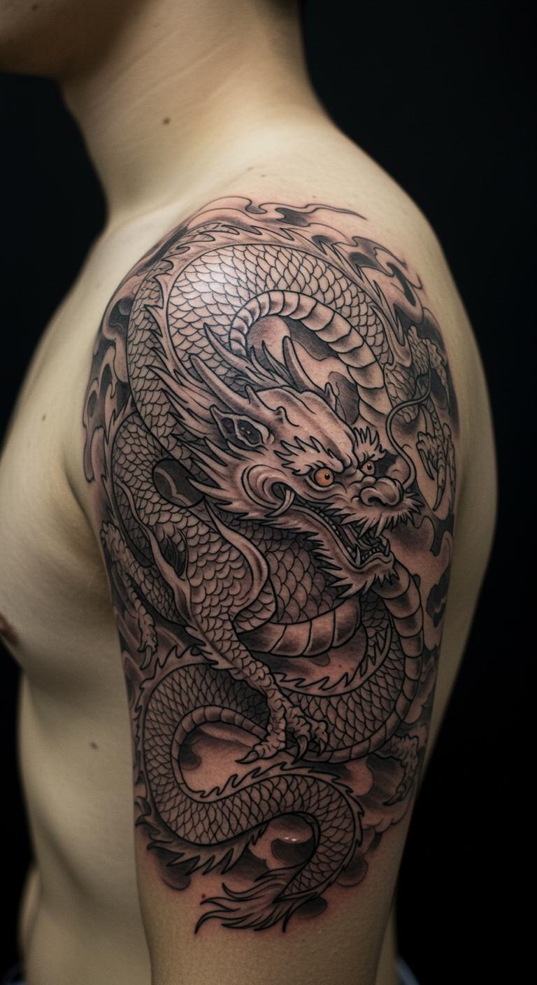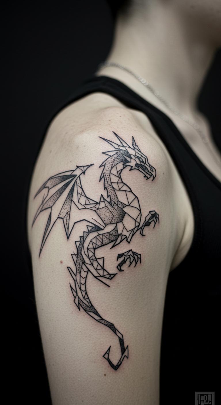 Mix geometry with a dragon for a modern abstract vibe that sparks confidence. See sharp angles and basic shapes forming the body on your shoulder. It’s unique and eye-catching. Start by cutting shapes from paper at home to visualize. Free online tools let you combine elements easily. Budget option: Get it from an affordable artist for $90-150. Real DIY: Experiment with string art on paper to mimic the design. Use this to represent personal growth in your ink. Wear tanks to show it off. Healing requires only gentle washing. This style stands out without overwhelming.