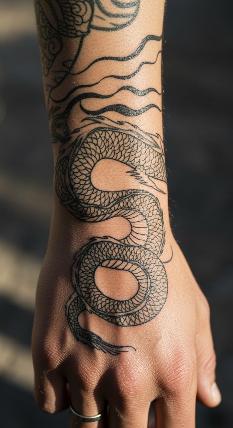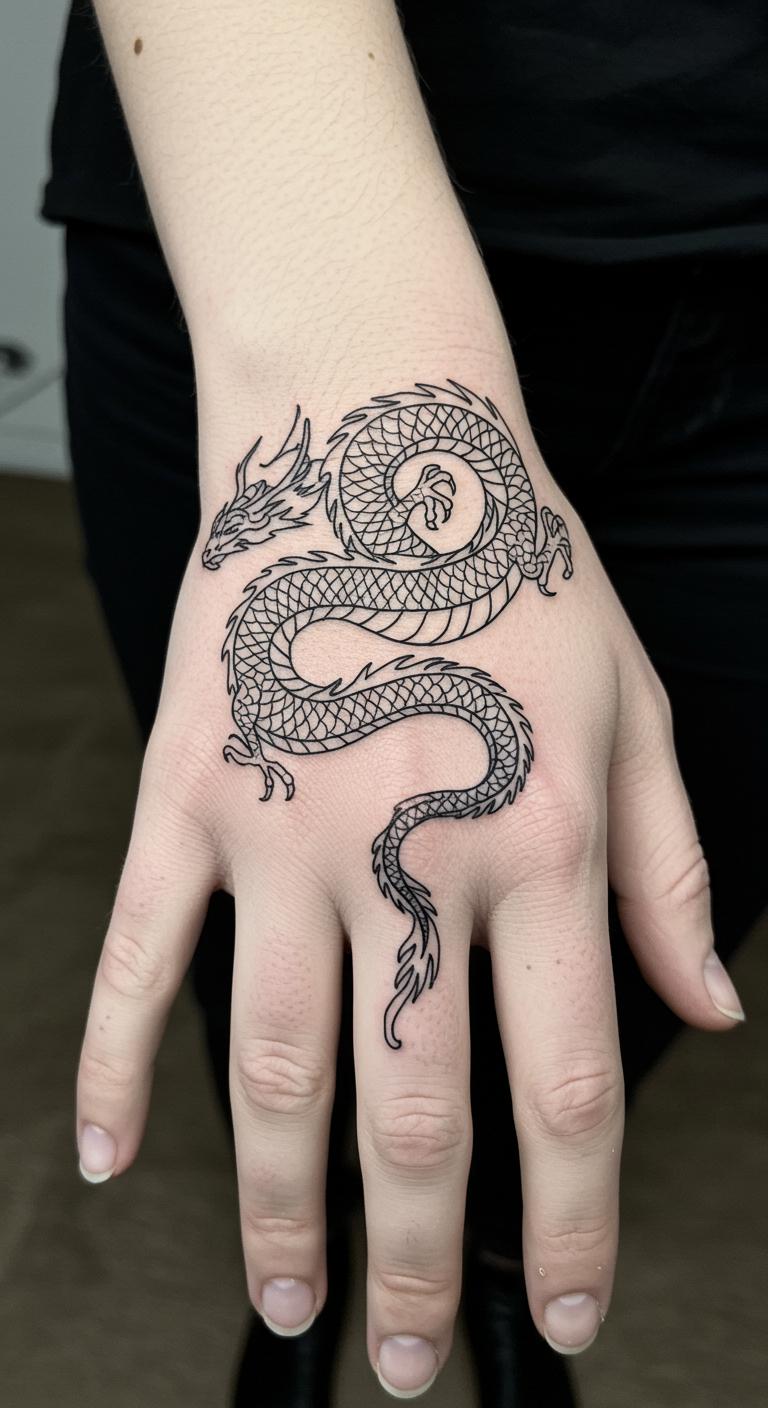 A wrist dragon acts as your personal shield, symbolizing protection in a clean design. Imagine sleek lines forming a watchful eye on this visible spot. It pairs well with watches or bracelets for everyday wear. Begin at home by printing simple dragon outlines from free sites and tracing them. Try a DIY stamp with washable ink to test the look. Budget idea: Opt for a stick-and-poke kit online for about $20, but always practice safety first. For the real deal, book a session at a nearby shop; expect $70-120. Focus on fine lines to keep it minimalist and cheap. This placement inspires confidence during interactions. Add a small detail, like a tail twist, to make it yours. Healing is straightforward with basic aftercare like unscented lotion. Wear long sleeves if you want discretion. In short, it’s a practical choice for building self-assurance.