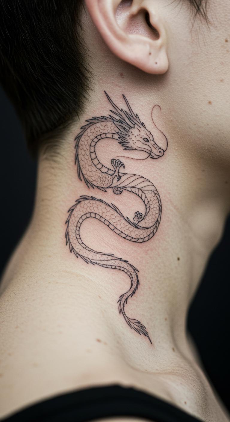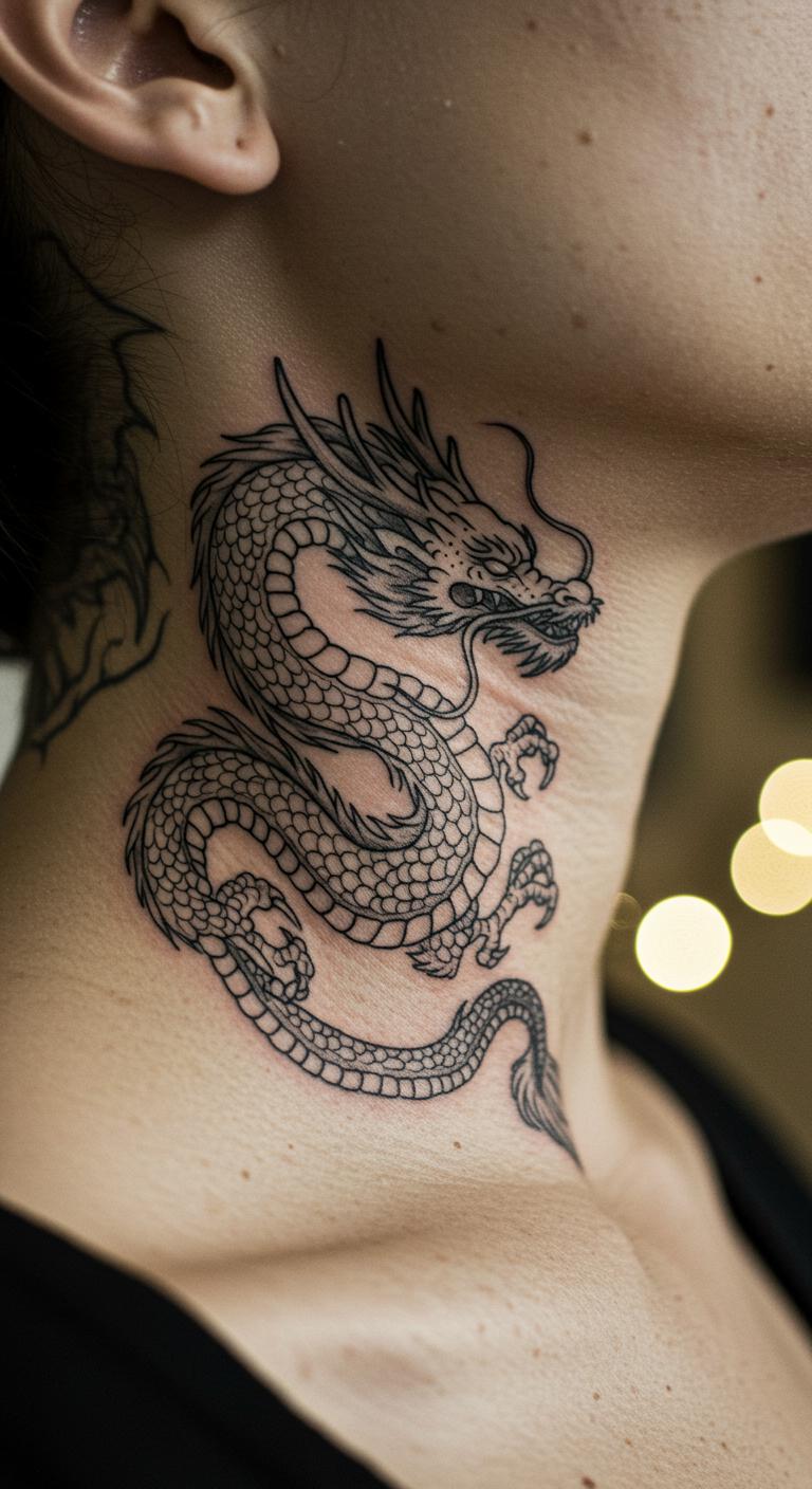 An elegant neck dragon adds a touch of mystery to your look. Envision delicate lines near the nape for a sophisticated feel. It’s bold when visible. Plan with a mirror and sketch pad. Online resources provide free ideas. Cost at a studio: $80-140. DIY test: Use stickers for a temporary try. This placement empowers in professional settings. Basic routines keep it vibrant.