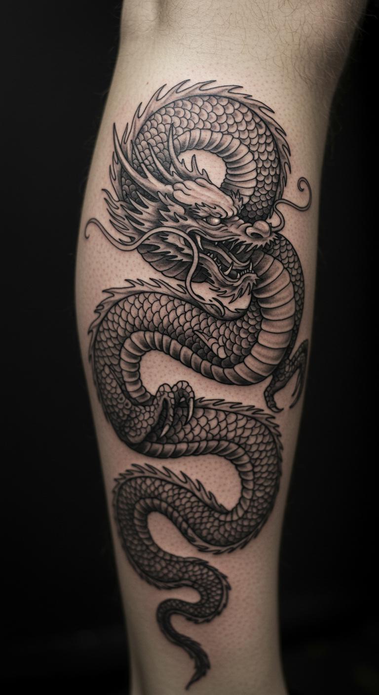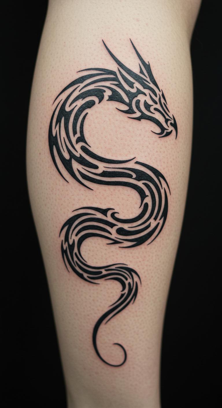 Go tribal with bold lines for a classic dragon that exudes confidence. Imagine abstract patterns on your calf that nod to ancient styles. It’s striking yet understated. Draw bold shapes at home with a thick marker. Free tribal templates are plentiful online. Expect $120-200 at a shop; focus on black ink only. DIY example: Use body paint for a washable version at home. This spot motivates during workouts. Cover with pants if desired. Simple aftercare ensures longevity.
