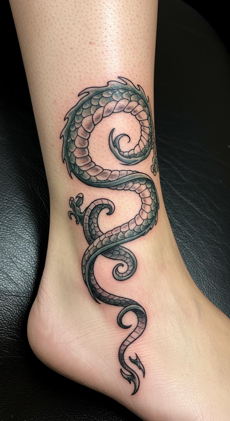 A small serpent on your ankle keeps things discreet and meaningful. See a simple looping form that wraps the bone. It’s perfect for subtle confidence. Trace a basic shape on your skin with a pen. Free apps help design it quickly. Shops offer this for $60-100. DIY: Apply with a home tattoo pen kit for practice, around $15. Wear socks to hide it. This design reminds you of resilience daily.