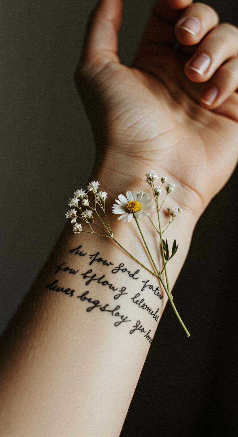 Incorporate script with wildflowers. It personalizes more. Write words on paper first. Practice handwriting. Find text experts cheaply. Online listings help. Make script small. Total near $60. Use sticker letters with drawings. Peel off later. Put on wrists for reminders.