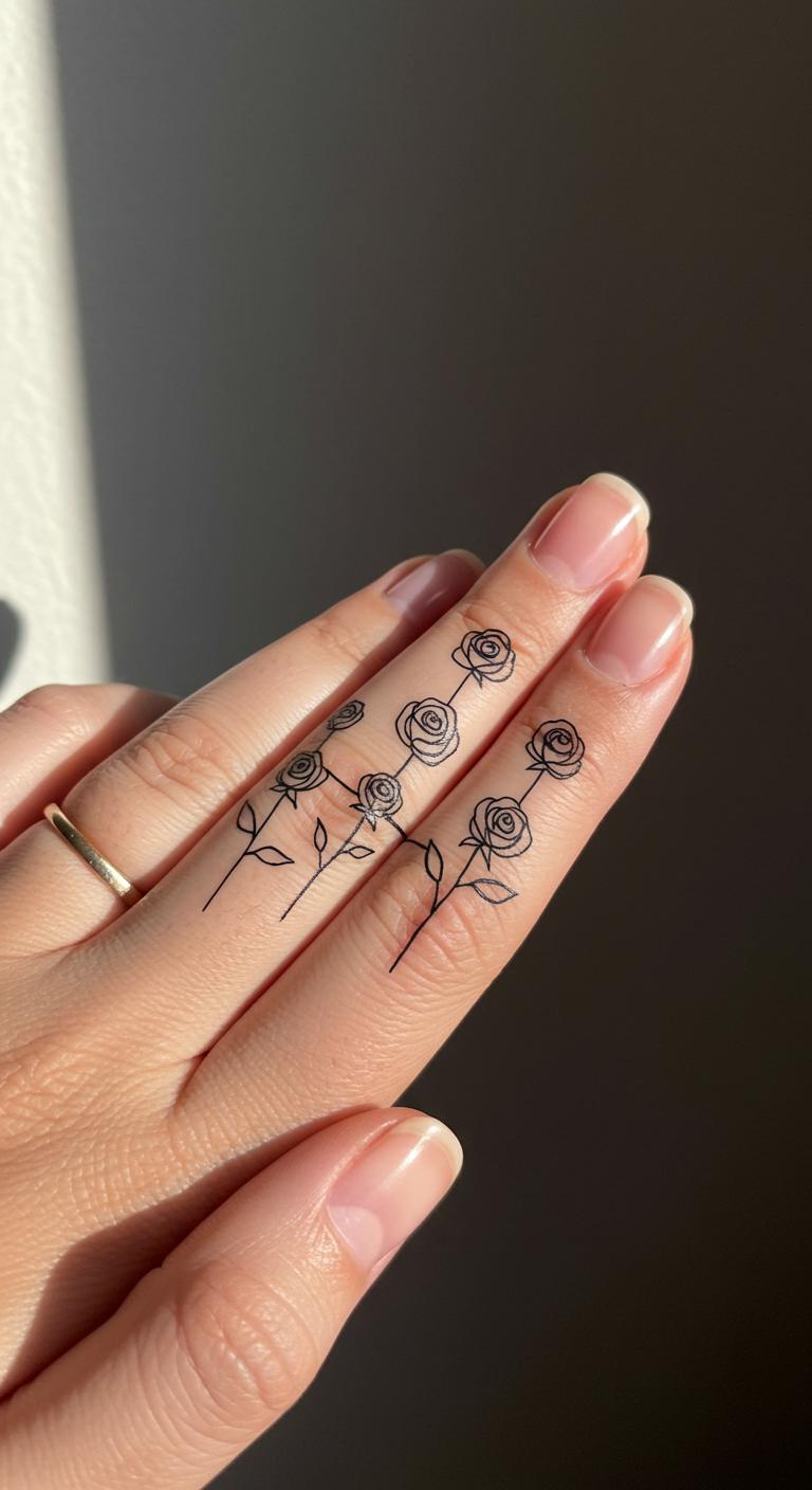 Line up roses on fingers. It’s modern. Chain draw on paper. Link them. Seek line specialists with deals. Available. Make the line short. Around $50. Use thread to outline. Tie and untie. Wear as daily art.
