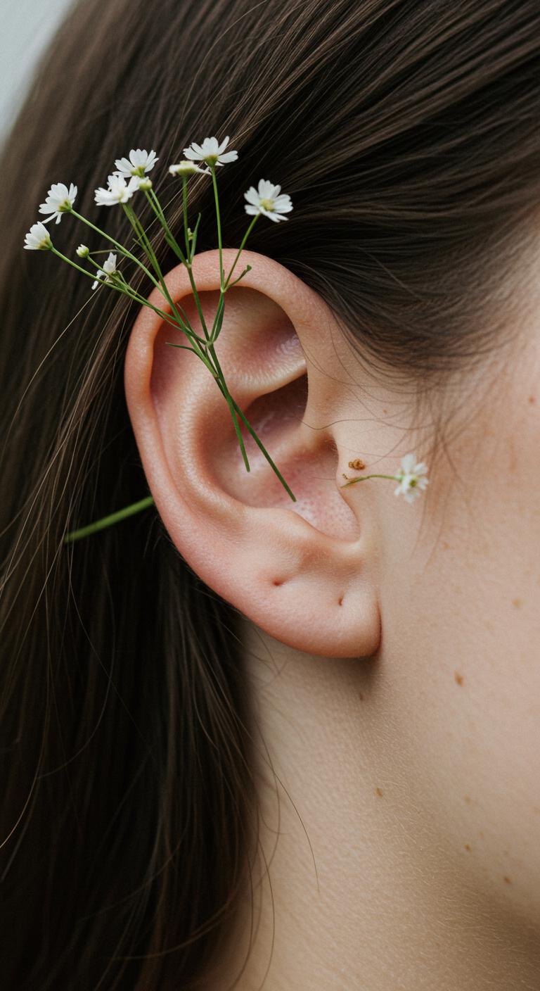 Double up wildflowers behind ears. Subtle charm. Mirror sketch for symmetry. Use markers. Find ear pros at low rates. Common. Keep them paired. Total near $55. Try with ear stickers. Stick and check. Hide or show as wanted.