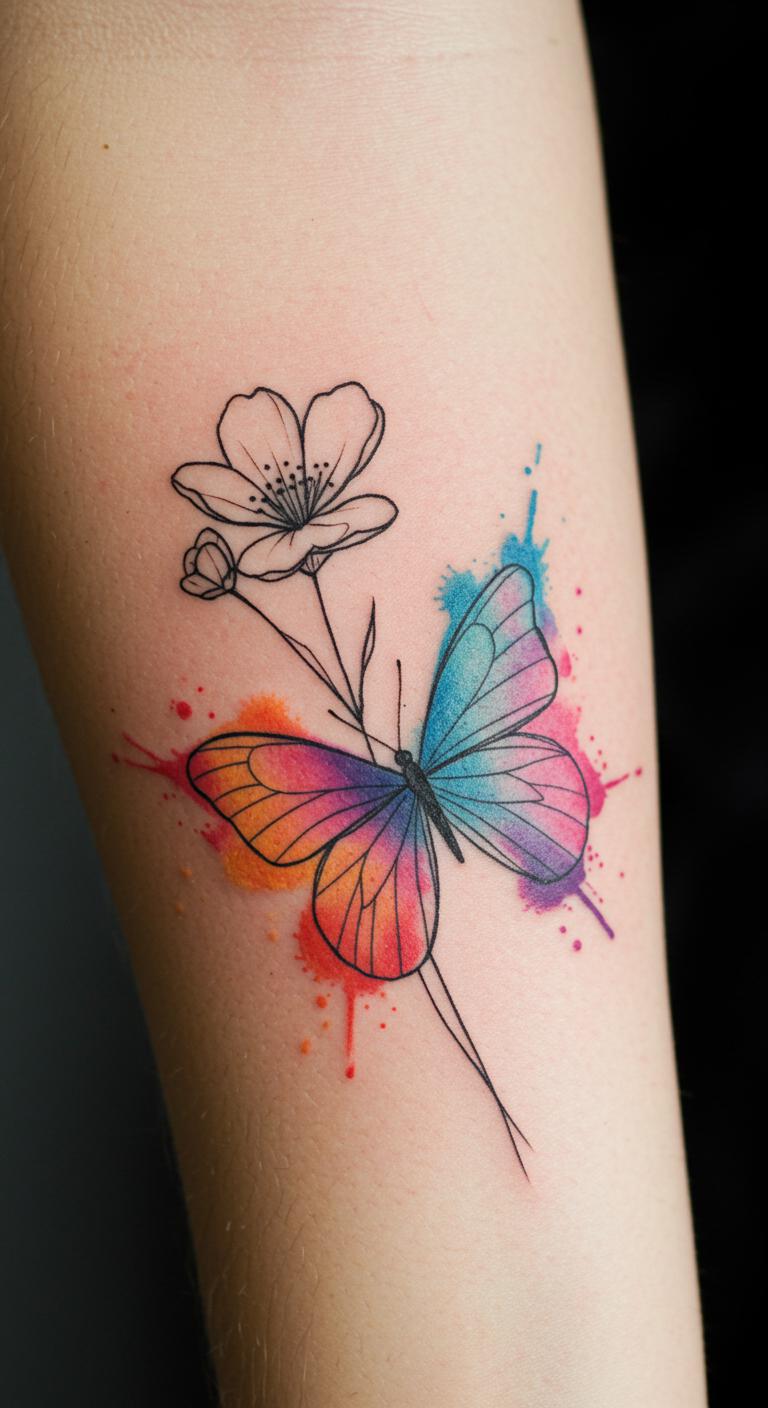 Add butterflies with watercolor effects near flowers for a soft, dynamic look. The natural blending of colors contrasts nicely with the simplicity of line tattoos. This style works well on larger areas if budget allows. Try temporary watercolors or skin-safe paints to simulate the effect before committing.