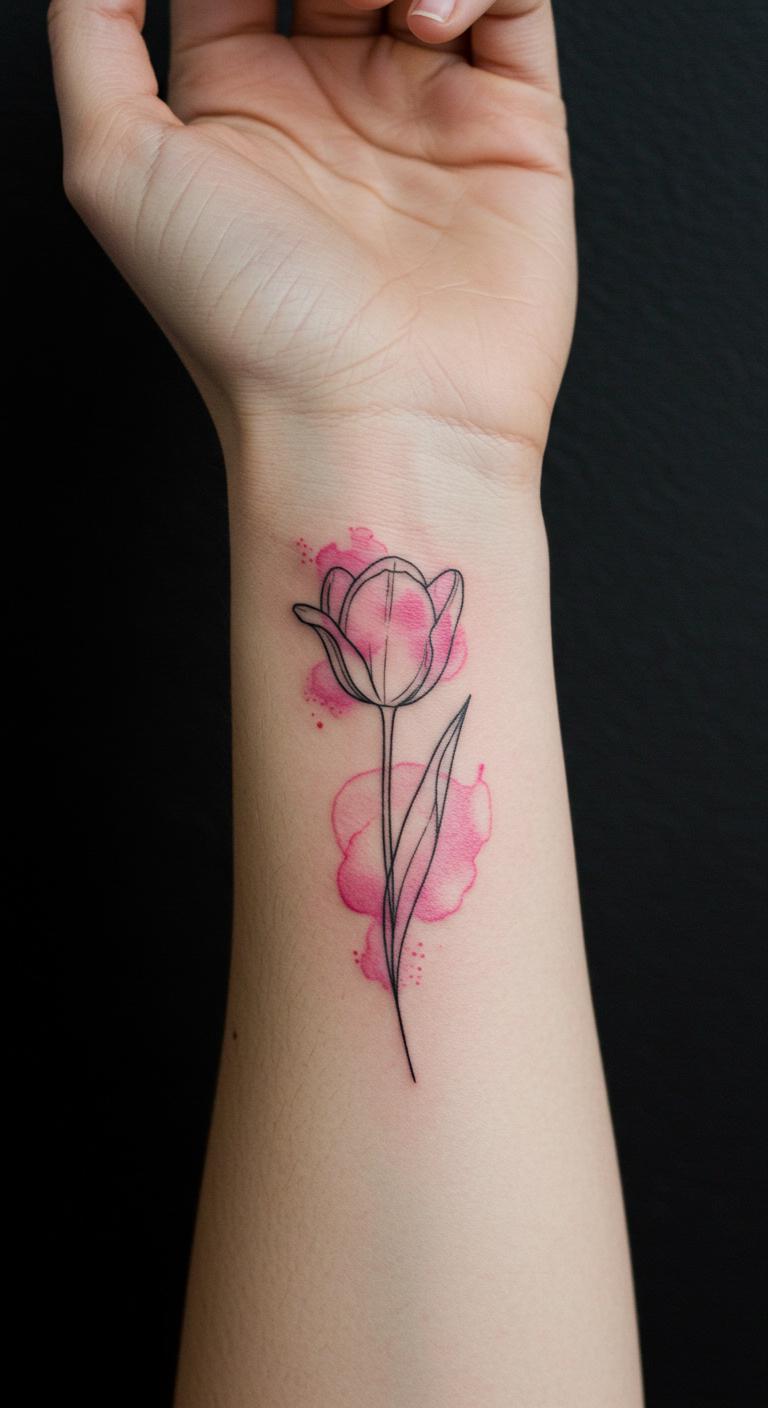 Watercolor effect adds subtle color without overwhelming the minimalist aesthetic. Choose a simple flower like a tulip and ask for faint color splashes inside the outline. This approach costs more than pure line work but remains affordable when kept small and focused. You can find DIY watercolor tattoo stickers to experiment with this look before booking. Placement on wrists or ankles makes it easy to show off or conceal.