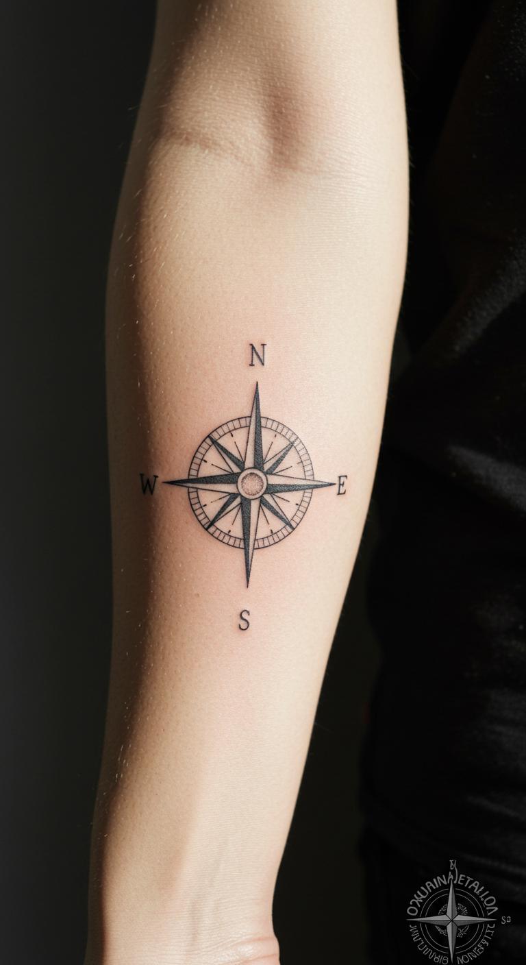 Compass roses guide on your forearm. Think of four directions in lines. It means navigation and adventure. Map compasses on paper.