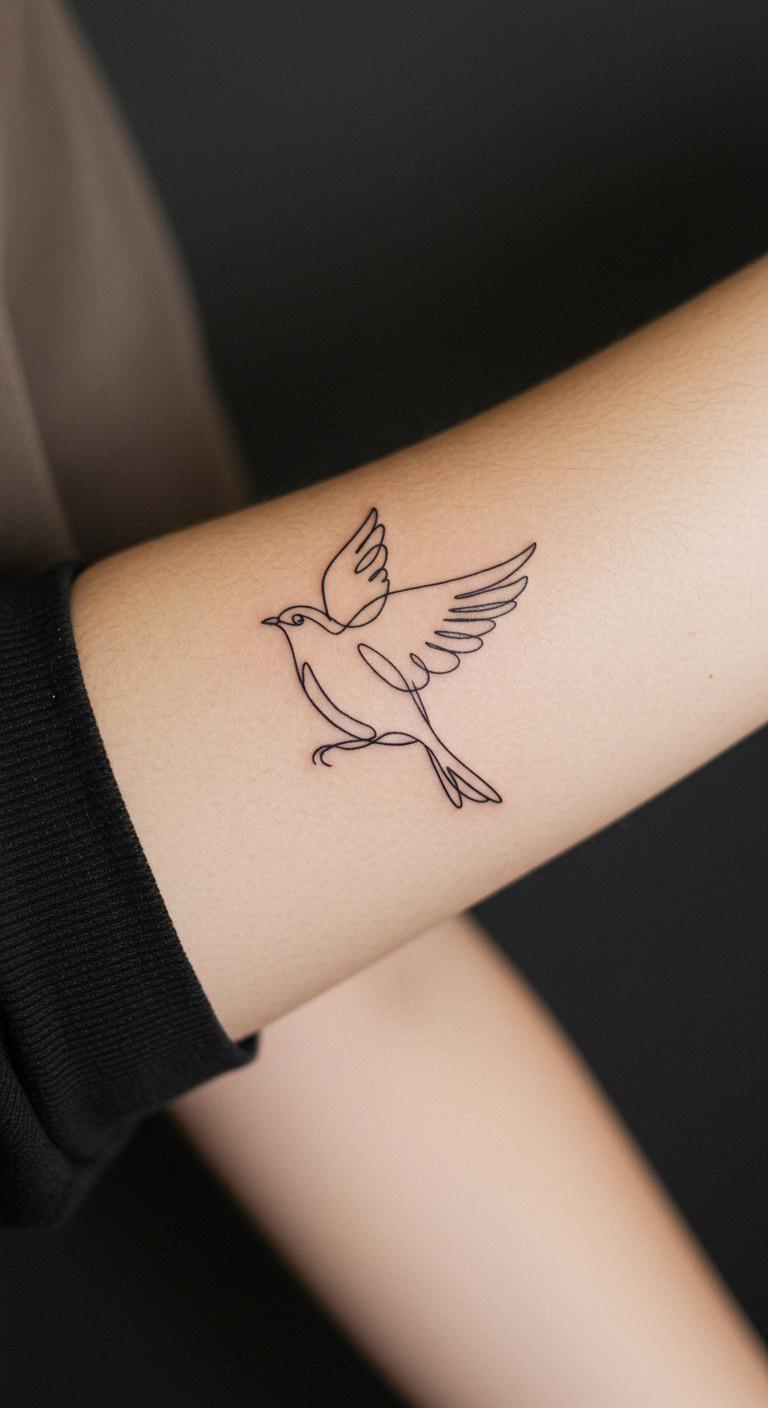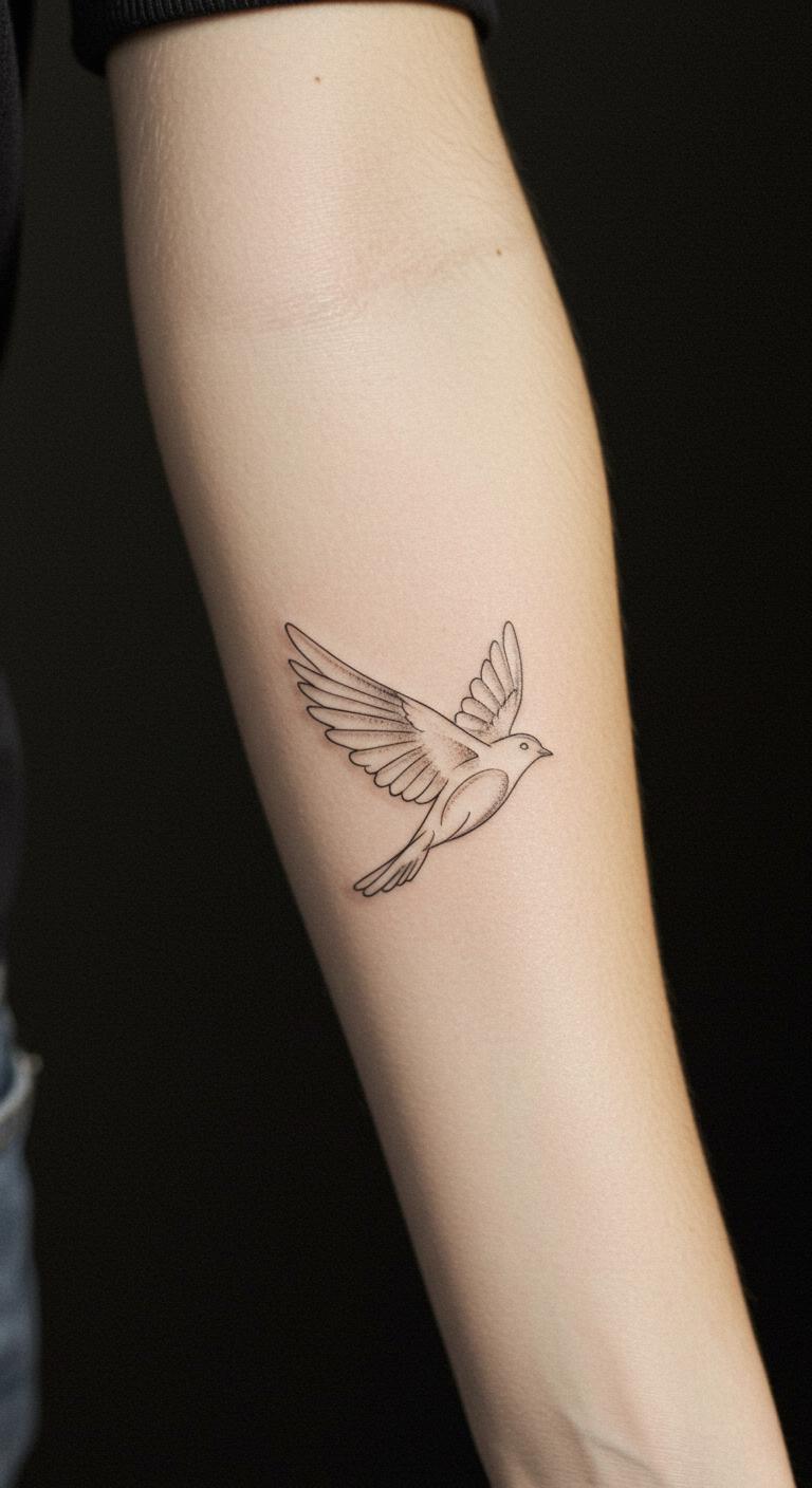 Bird in flight tattoos soar on your forearm. Picture a swift line of wings. It captures freedom and lift. Sketch birds from the sky.