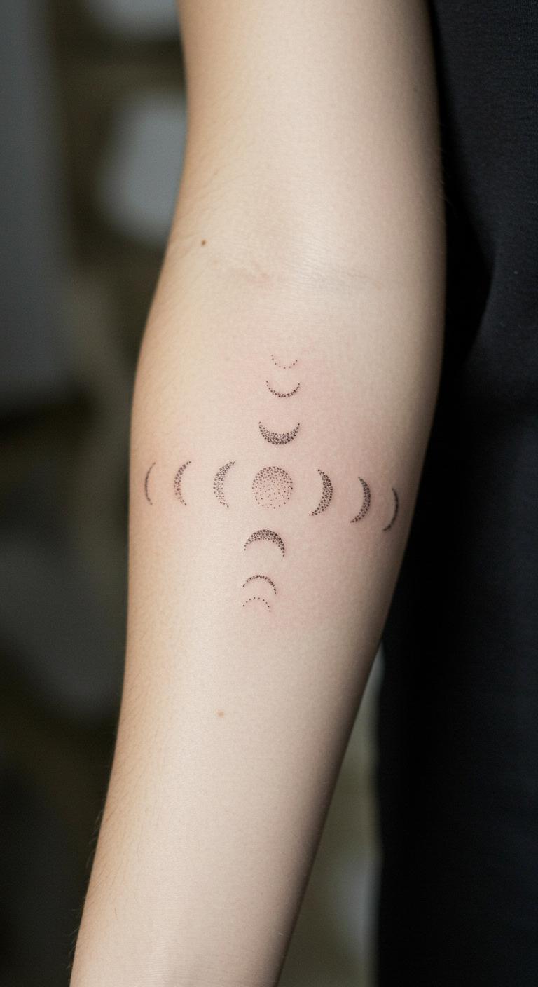 Moon phases cycle on your forearm. See a row of crescents. It tracks time and mystery. Draw phases from moon apps.