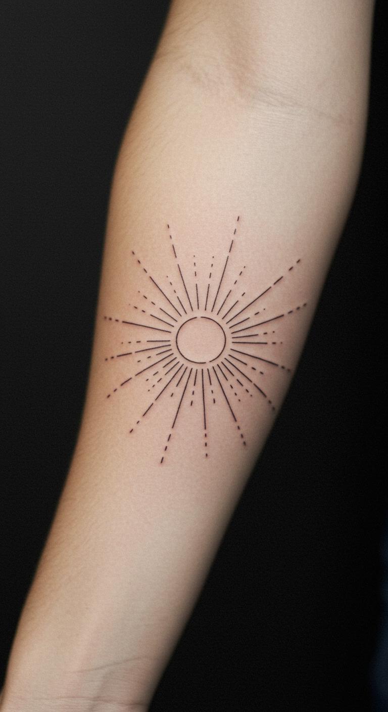 Sun and rays brighten your forearm. Imagine radiating lines from a center. It brings warmth and energy. Draw suns with crayons.
