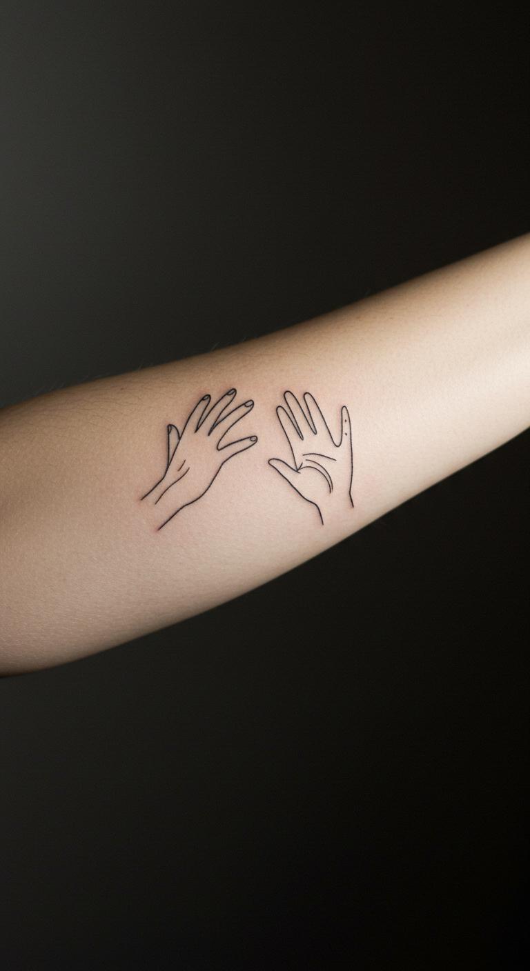 Hand holding tattoos connect on your forearm. Picture two palms linked. It shows bonds and support. Draw hands from photos.