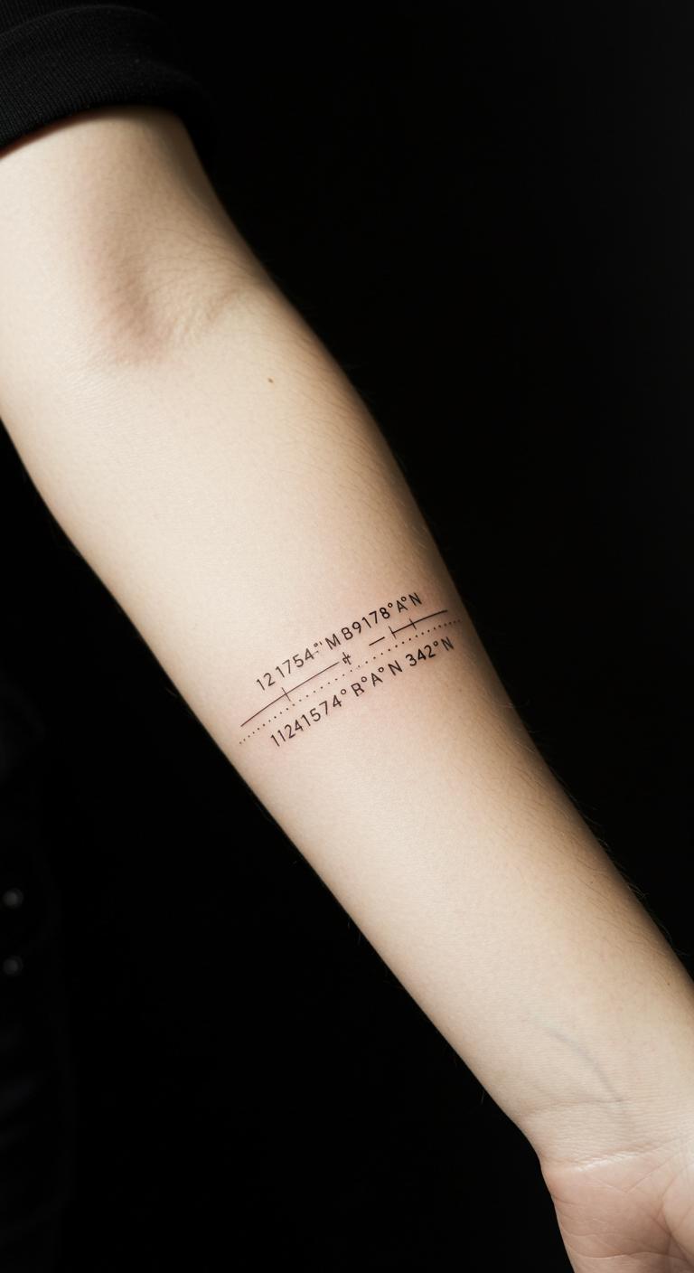 Coordinates and dates mark spots on your forearm. Think of a latitude for a special place. It holds memories in ink. Map out locations on free apps first.