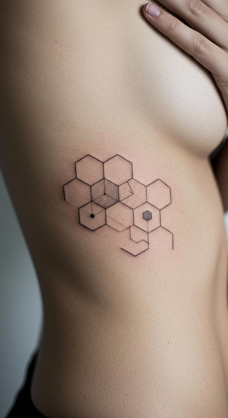 Hexagons mimic honeycombs for a natural geometric feel. They stand for community and efficiency. Trace hexagons on scrap paper to start. Free grid templates online help with layout. Use cheap stickers to mock up on your body. Artists with geometric specialties often have set rates for repeats. Place on the rib for a personal touch. Vary the number of hexagons for scale. Try fabric markers for temporary tests at home. These actions keep costs down.