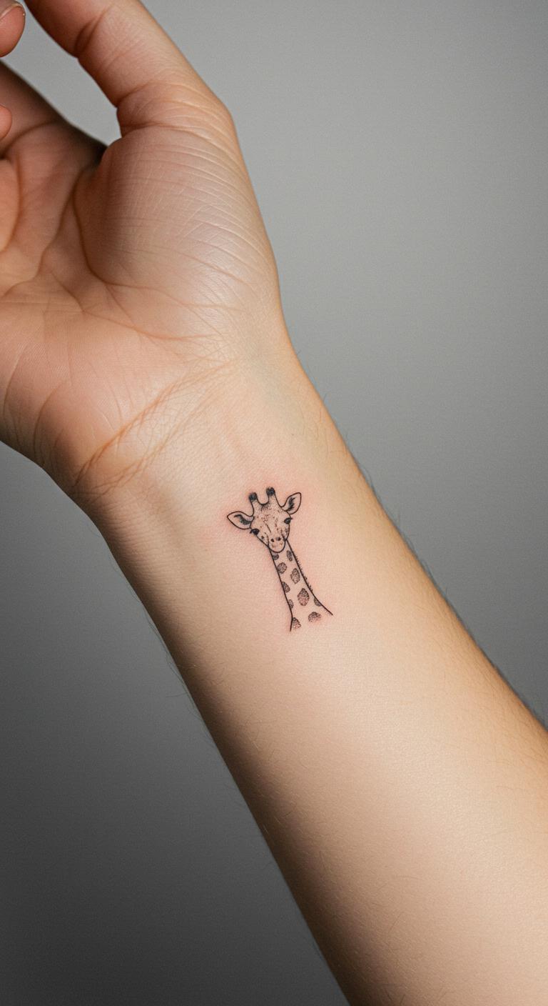 Wrist spots work well for a discreet giraffe tattoo. This area balances show and hide easily. It ties to personal grace in daily life. Trace the design on your wrist with washable ink first. Use a string to measure the curve. Temporary stickers cost just $3 and help decide. Artists offer this for about $40. Wash with mild soap to care for it. You pick a spot that fits your routine simply.