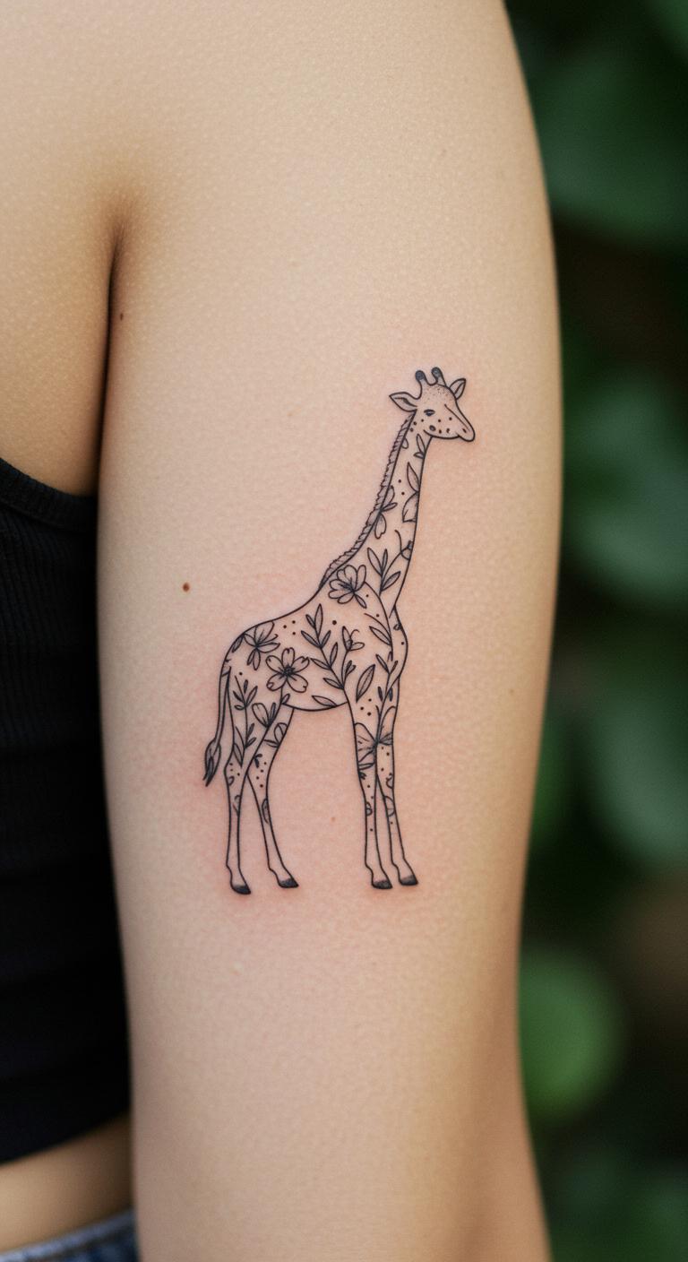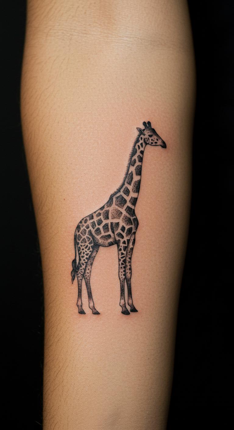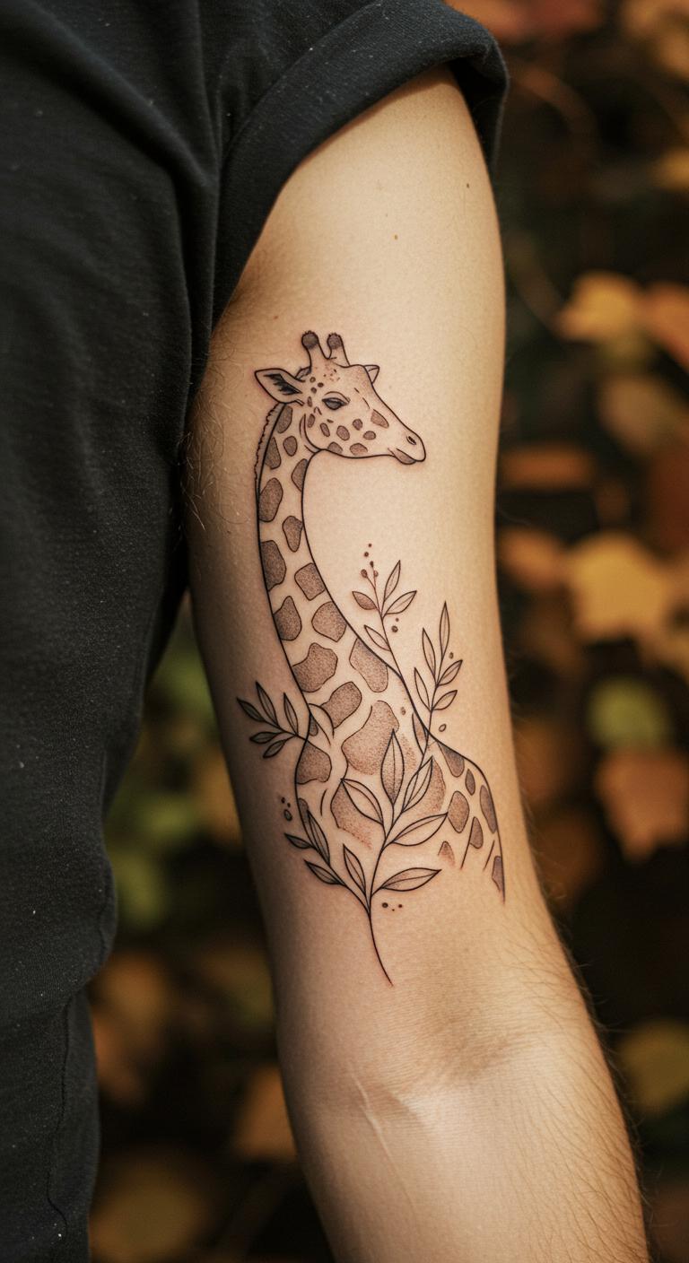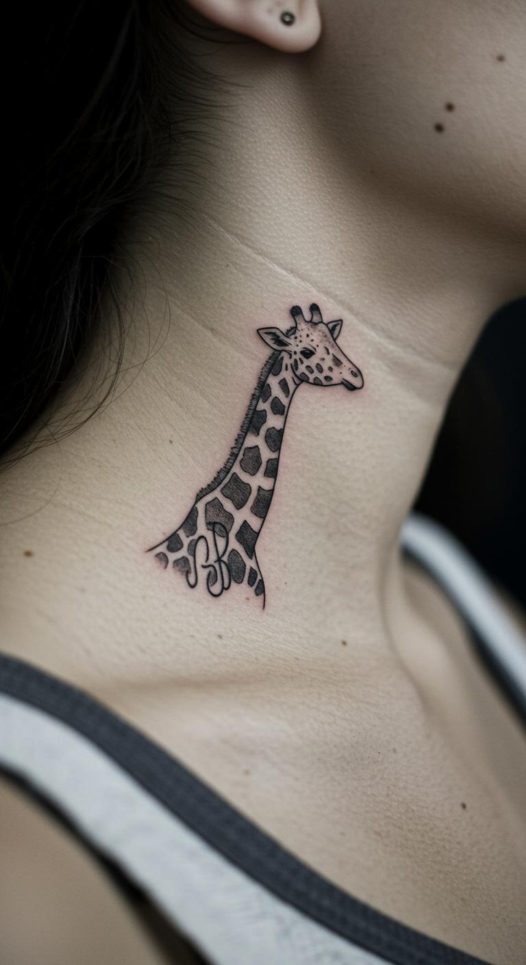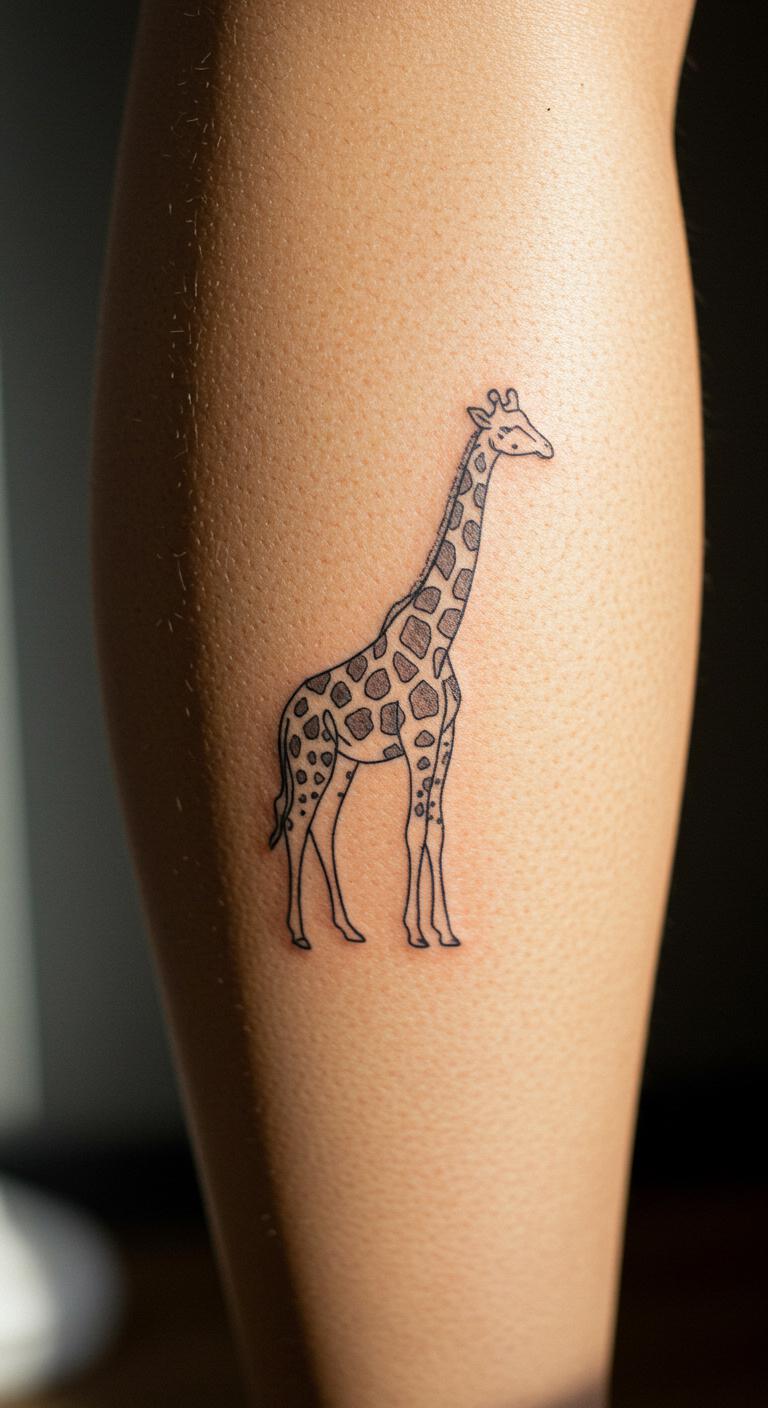 An upper arm giraffe lets you make a subtle statement. It’s visible when you want, hidden otherwise. This placement echoes the animal’s height and poise. Sketch it on your arm using a mirror and pencil. Add a small line for emphasis. Try wash-off tattoos for $4 to preview. A session runs around $90. Apply sunscreen to protect it outdoors. You control how and when to share your ink.