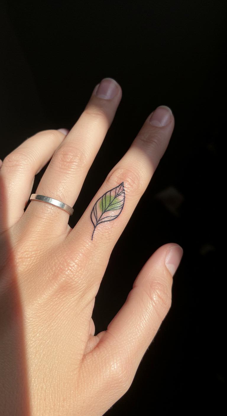 A finger leaf is perfect for something ultra-small and personal. Keep it to one line for simplicity. Test with ring designs using household items. Place it where you gesture often. Choose tiny sizes for budget sessions. Add a personal symbol within it. This represents fleeting moments. Moisturize regularly for longevity. Quick and meaningful.