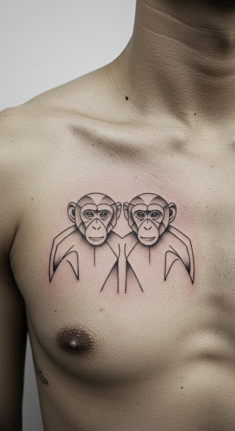 Two monkeys in symmetry for balance. It’s striking. Plan symmetry on paper. Budget for $85. Use symmetrical stencils. Mirror the design. Bold the key: plan symmetry. Place on chest. Get it done.