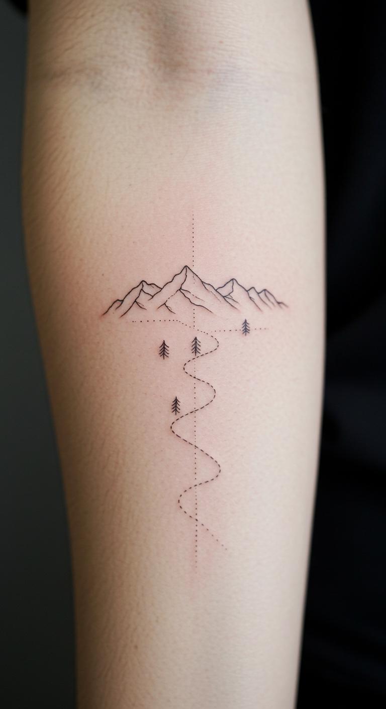 Add faint trails to a mountain for a journey theme. This uses super-thin lines to show paths upward. Try it on your arm for daily sight. Draw trails on maps at home. Look at free path tutorials online. Tie it to goal-setting sessions. Go thin to lower costs. Sketch with fine markers on paper. It illustrates personal growth clearly. Modify trails based on real trips. This idea is precise and motivating.