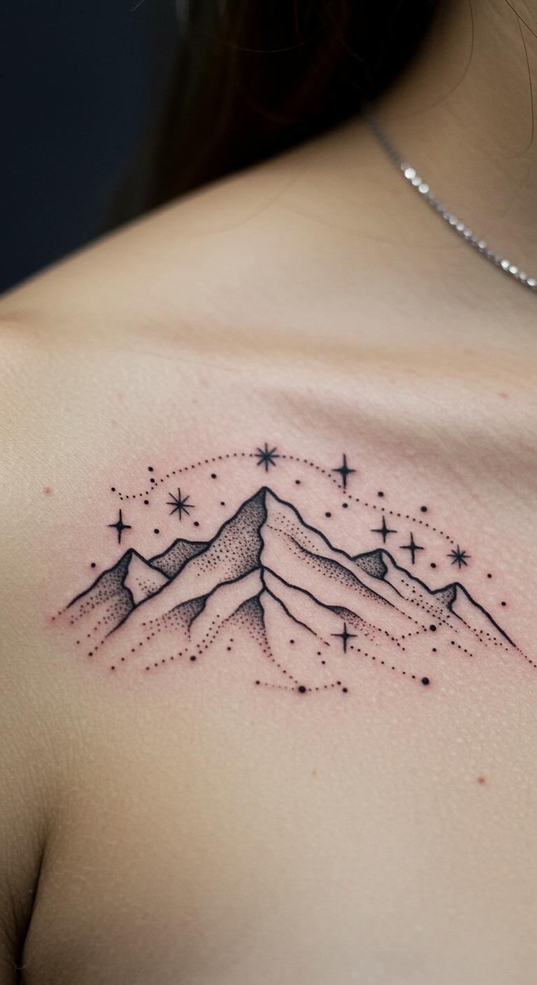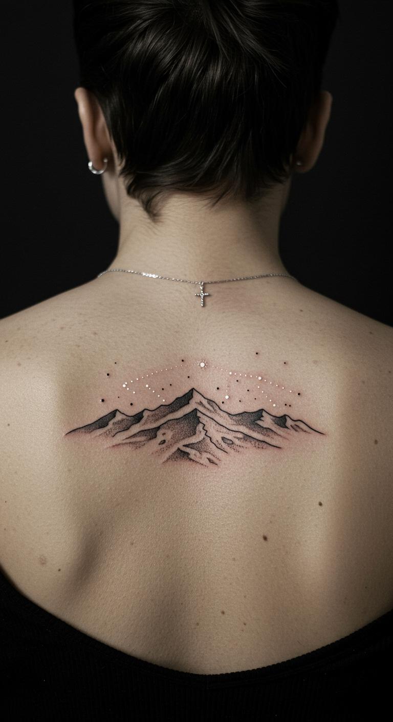 Dot stars around mountains for a night sky theme. This scatters small dots near peaks, evoking wonder. Place it on your back for a full view. Star-map on paper with mountains. Find free night sky resources online. Stare at it for calm nights. Use dots only for savings. Simulate with glow stickers. It sparkles with mystery. Customize stars for memories. This design lights up your world.