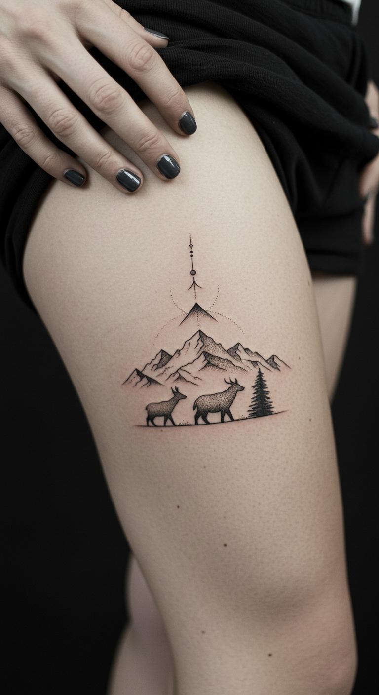 Add an animal shape to a mountain for wild spirit. This places silhouettes like birds with peaks. Put it on your thigh for strength. Animal-draw beside mountains. Search free wildlife tattoos online. Link it to nature outings. Use basic shapes to save. Mock with animal cutouts. It captures freedom. Customize the animal choice. This idea roams free.