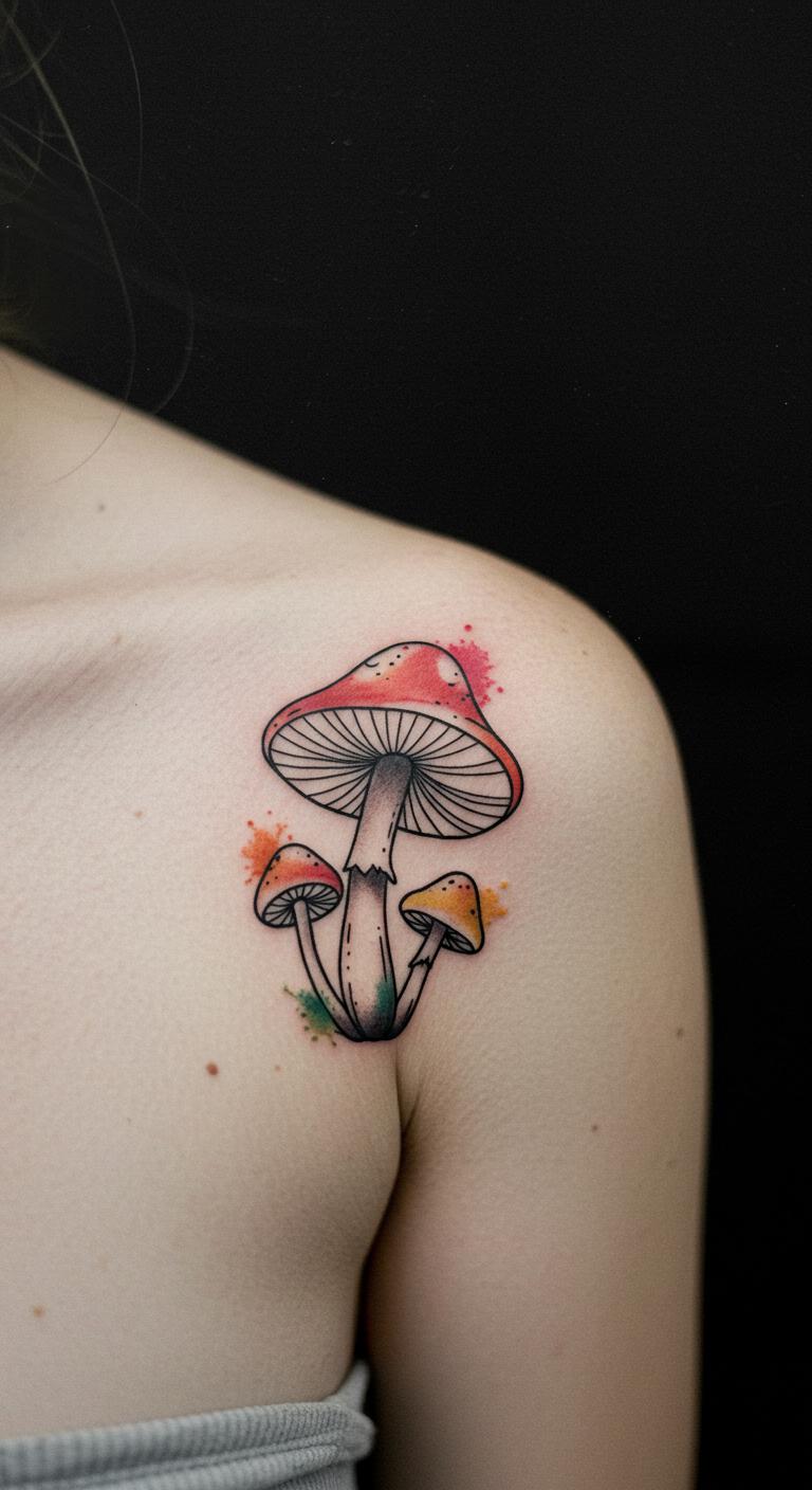 Add a hint of watercolor shading to your mushroom. Keep it light and ethereal. Experiment with watercolors on paper at home. It’s a creative, low-budget activity. Artists could do this for $70. Place it on the shoulder for balance. Bold the key: try watercolors. This helps test the look. Use it as a dreamy symbol. Simple home trials make it fun.