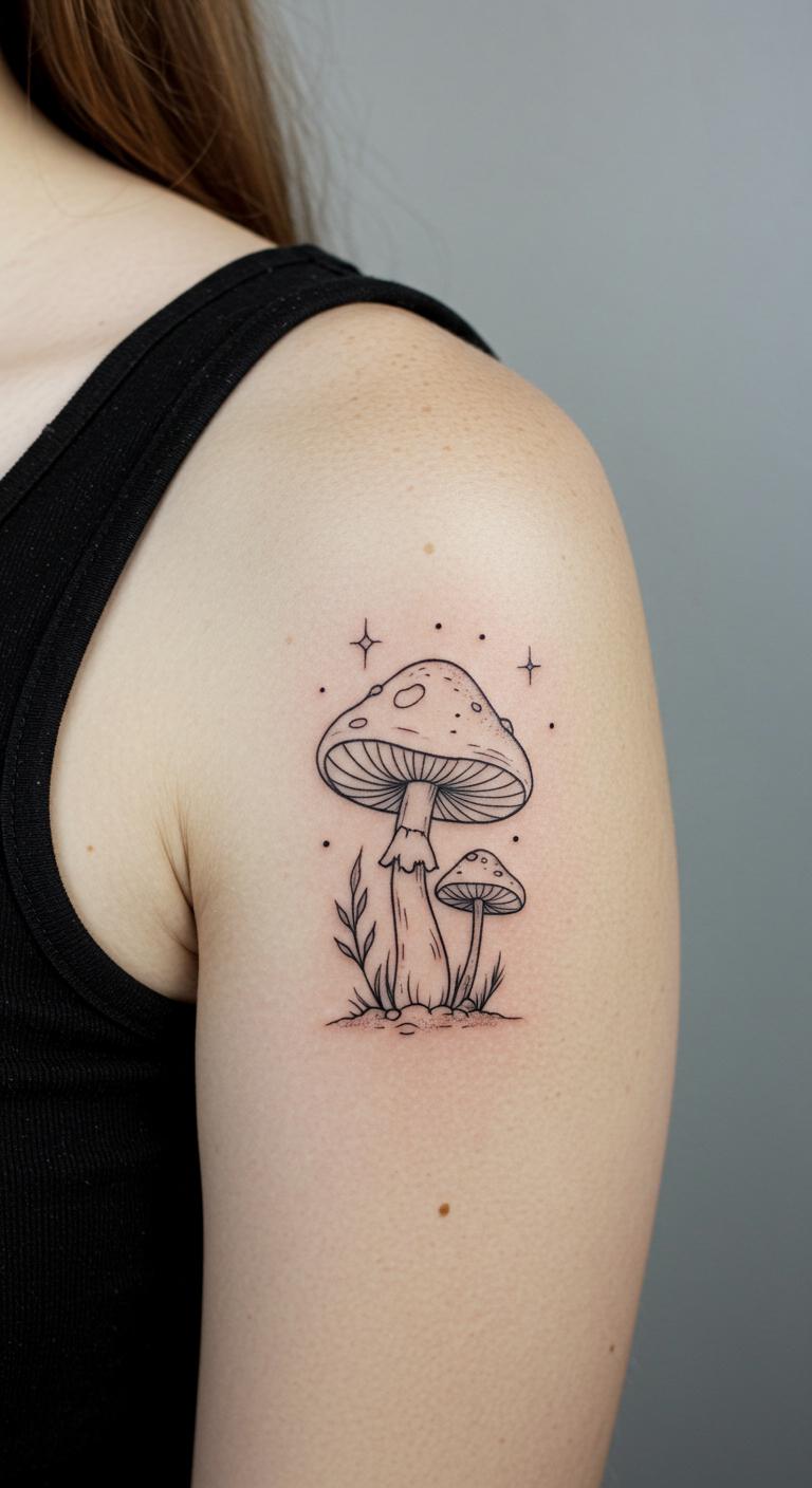 Create a scene with a mushroom at the center, like adding a star or leaf. Keep it minimal for timeless appeal. Sketch the basics at home with crayons or markers. This builds your concept affordably. Find artists who offer simple add-ons for around $70. Opt for the shoulder to blend with clothing. Bold the key: experiment with crayons. It’s a fun, low-cost way to plan. Let this design tell your story of magic. Easy steps like home drawing make it accessible.