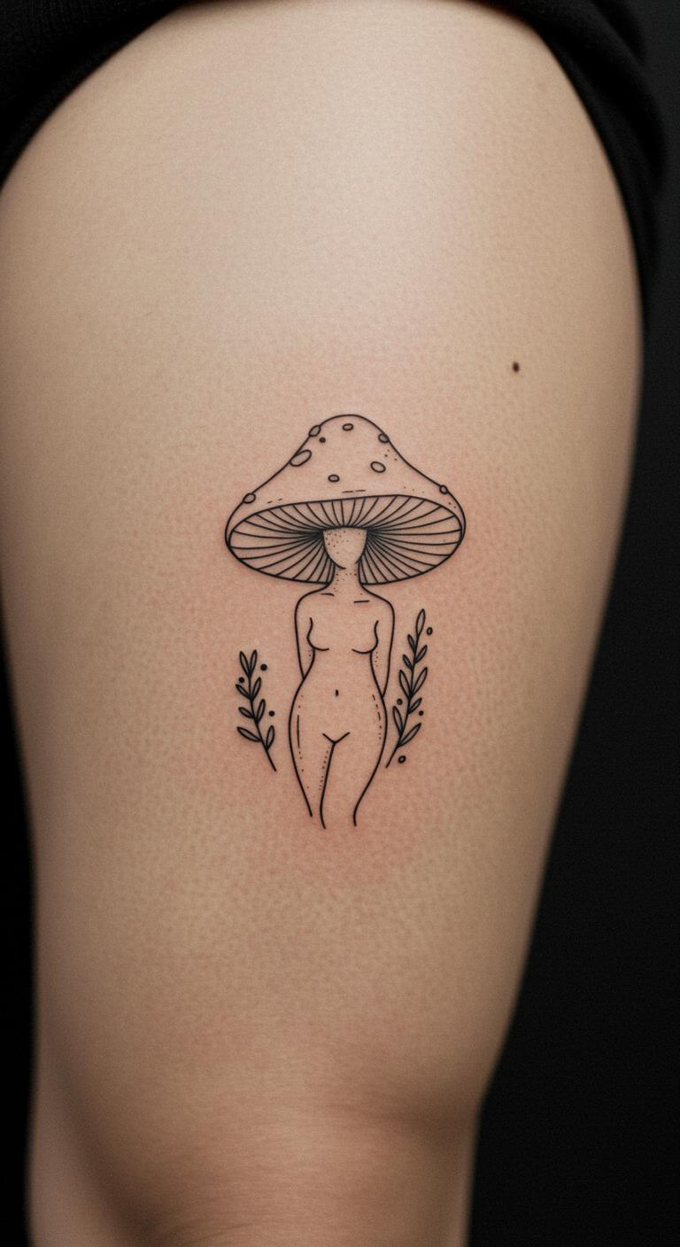 Blend a lady figure with a mushroom for a feminine design. Outline the shape simply on paper first. Use free apps on your phone to refine it. Artists might charge $90 for this style. Place it on the thigh for a private touch. Bold the key: use free apps. This helps visualize without spending. Make it a symbol of strength. Quick digital sketches keep costs down and ideas flowing.