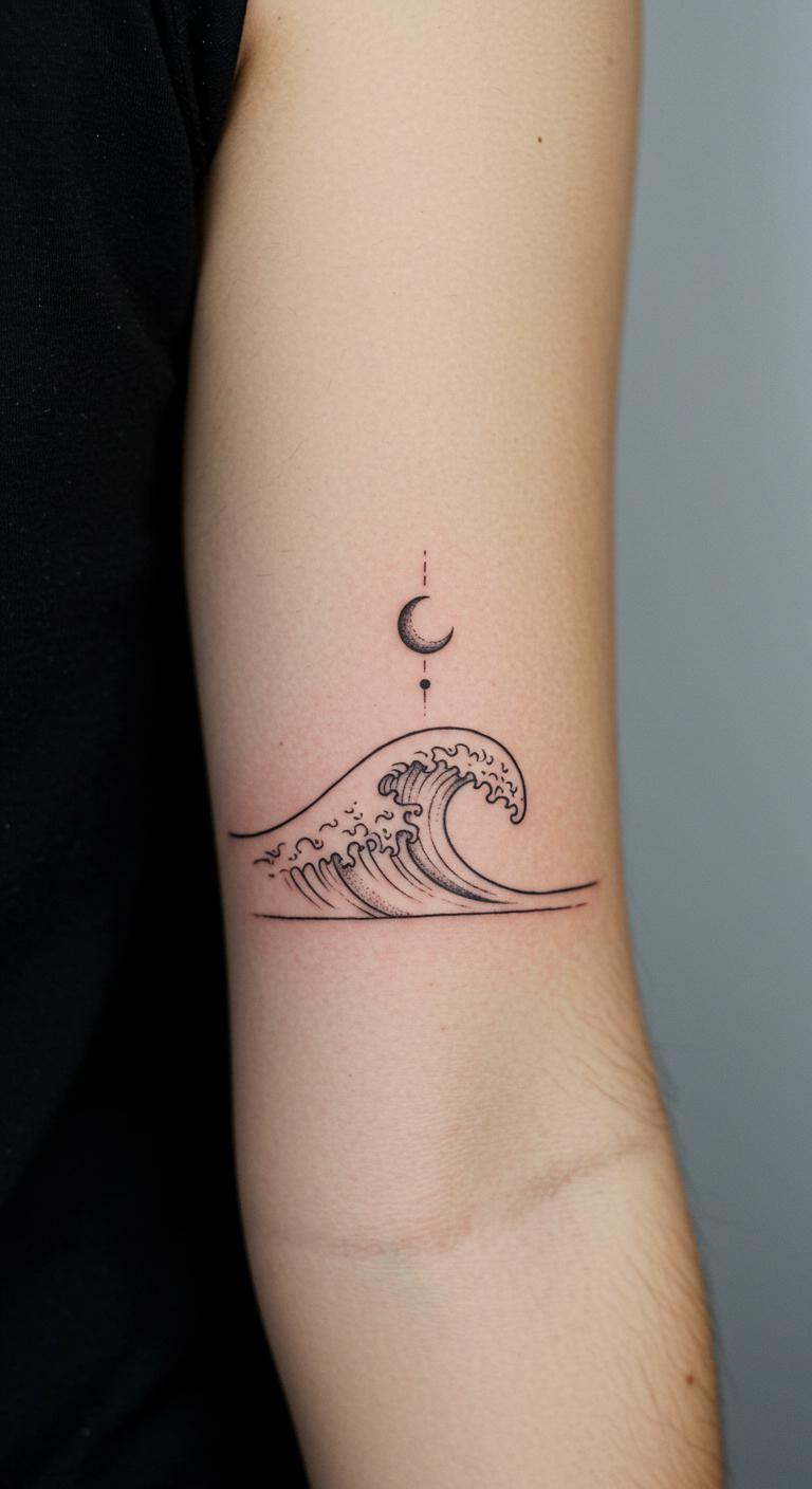 Add a moon to a wave for dreams. Plan it on paper simply. Try temporary options. Place on your arm discreetly. Black designs are affordable. It suggests journeys, so connect personally. Free design tools help. Look for combo deals. Customize the moon phase. Easy to handle at home.
