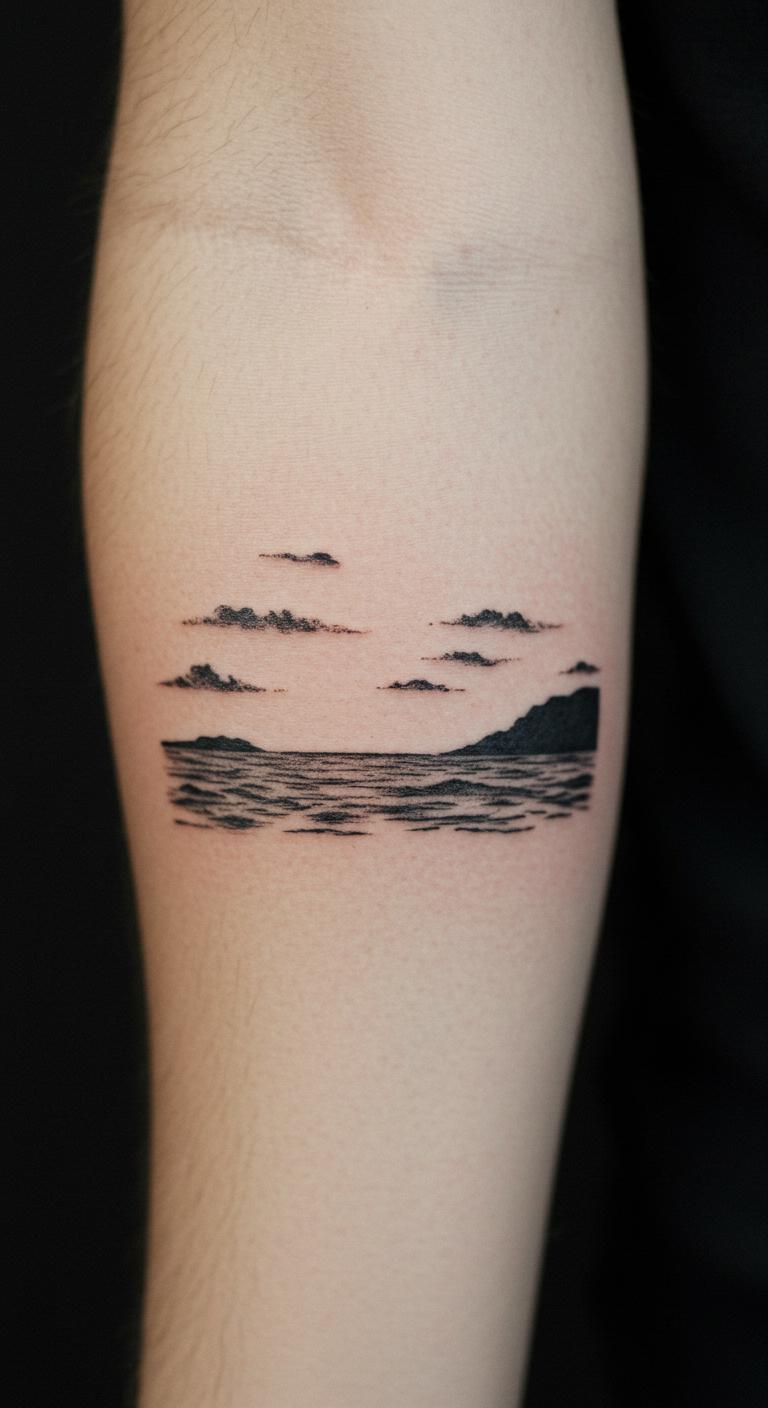 A seascape silhouette paints a scene minimally. Outline it at home. Try with paper cutouts. Place on your forearm. Black silhouettes save money. It means serenity, so tie to calm. Free images online. Quick artist work. Add personal shades. Basic maintenance.
