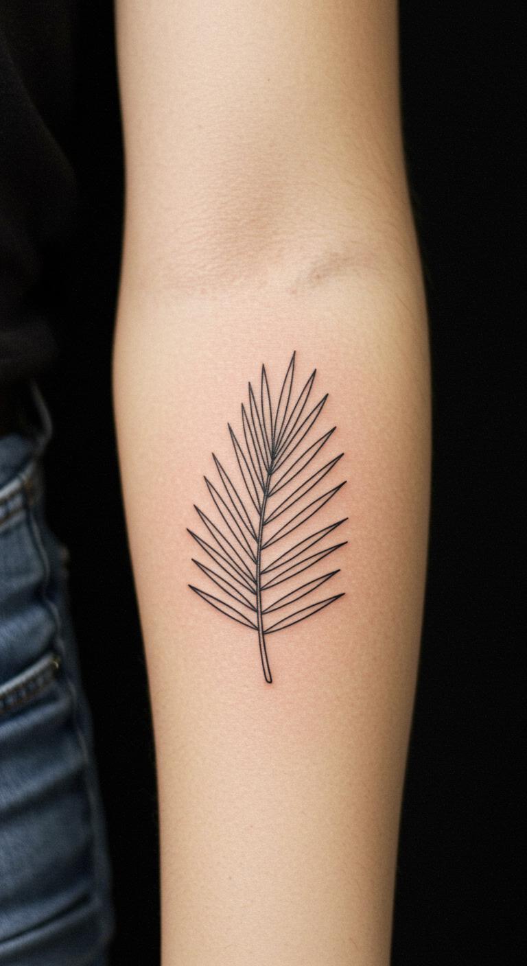A single palm frond keeps it tropical. Outline it quickly. Practice with leaves. Place on your arm. Black fronds are affordable. It means relaxation, so tie in. Online outlines free. Budget artist options. Customize the veins. Basic care needed.