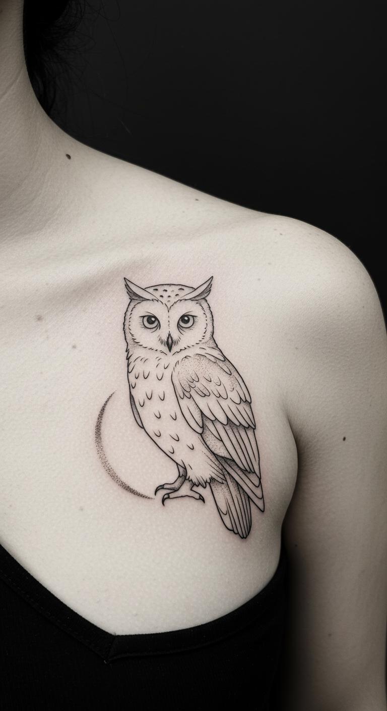 Pair an owl with a moon for a night-inspired look. The owl sits under a simple crescent, adding depth to the design. Place it on your shoulder for easy hide-or-show vibes. This combo nods to mystery and cycles of life. Save cash by drawing it yourself on paper with basic tools. Use a circle for the moon and lines for the owl. Visit a budget artist who specializes in line work. Opt for black and gray to keep it affordable. Think small: a tiny version fits anywhere and costs less. Aftercare is simple—use drugstore lotion to keep it moist. Wear it as a reminder of quiet nights. Make it personal by adding a small dot for a star. This design works well for first-timers since it’s not too bold.