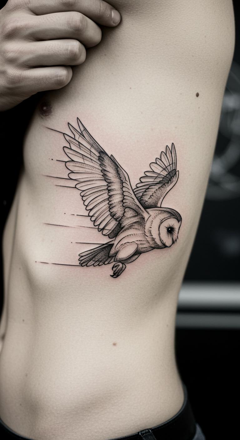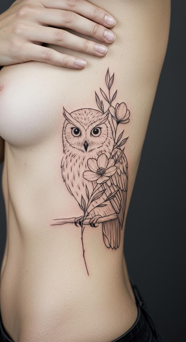 Add flowers to your owl for a nature touch. Place it on your side rib for a hidden gem. Simple lines make the flowers pop. Sketch flowers and owls together at home. Use garden photos for ideas. Find a cost-effective artist for nature themes. Limit to a few elements for savings. Keep it modest in size. Care with basic skin products. Let it symbolize growth in your routine. Personalize the flowers from your drawings. It’s feminine and versatile.