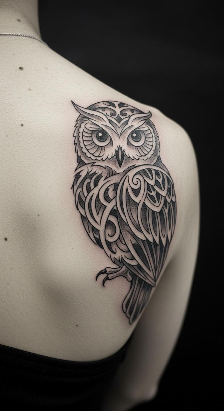 Incorporate tribal patterns into your owl for cultural flair. Sit it on your shoulder blade for tradition. Use repeating lines for the effect. Practice tribal designs on paper. Look at cultural art for free. Select a budget artist for this style. Opt for outline to save. Make it small for economy. Use household items for aftercare. This design honors heritage daily. Add your twist from sketches. It’s meaningful and bold.