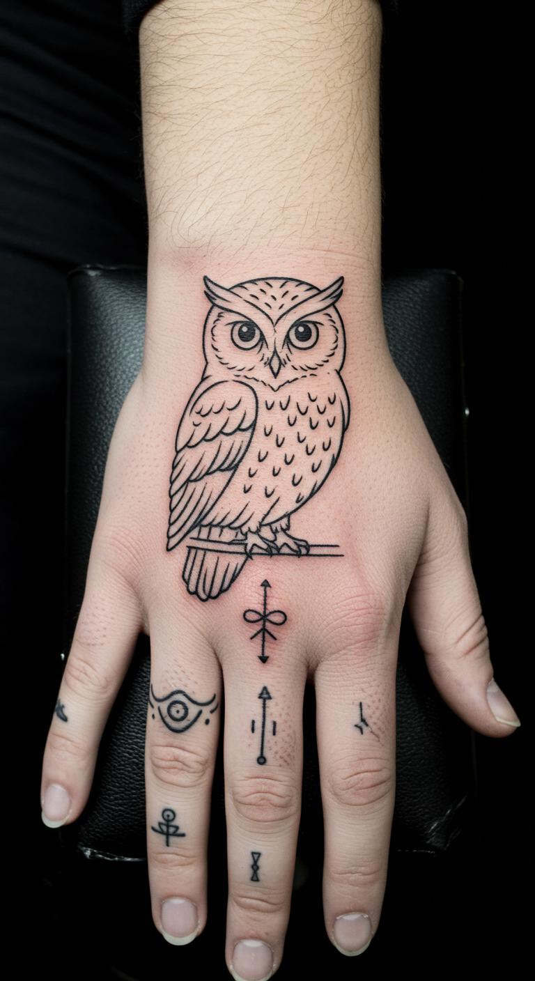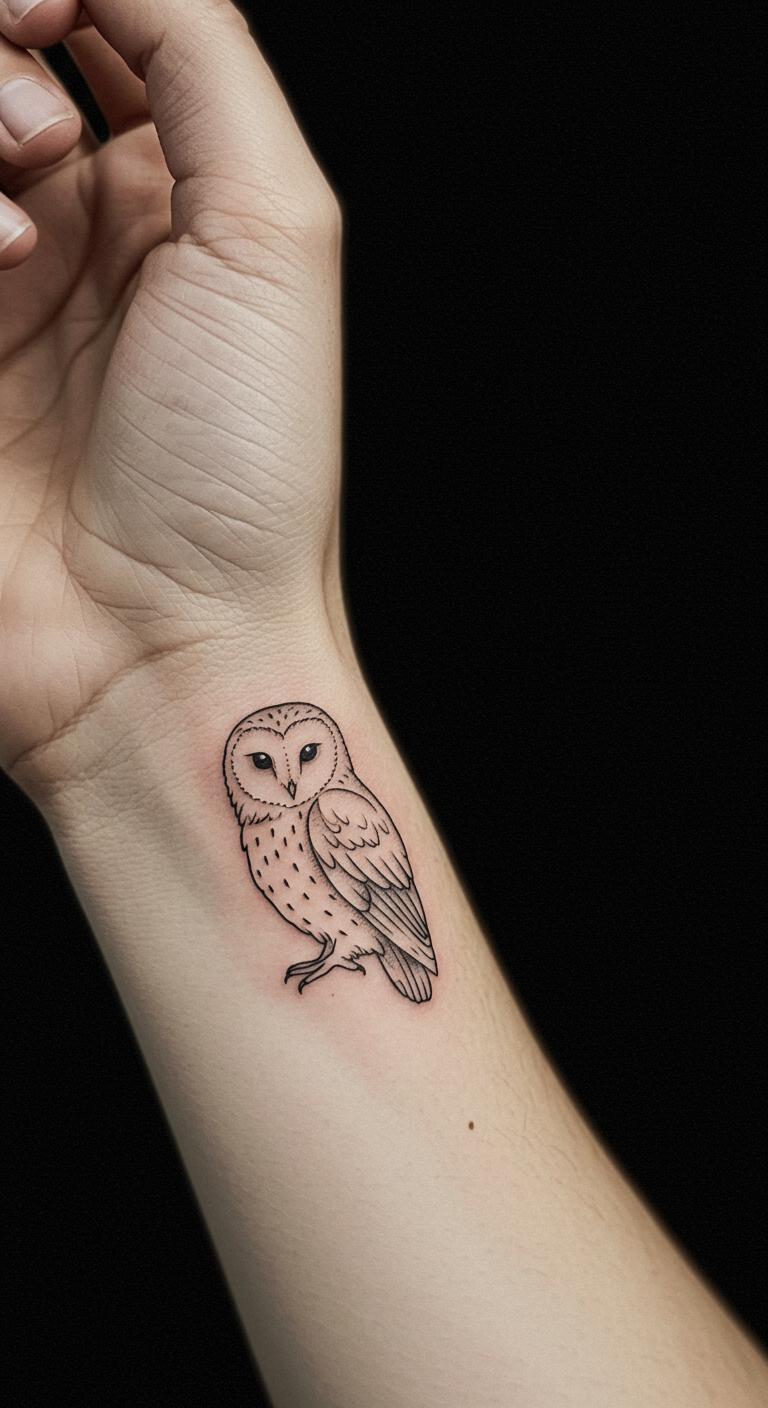 A small owl on your wrist keeps it discreet. This spot makes it easy to see. Just a few lines do the trick. Draw mini owls on your hand first. Find small design ideas online. Go to a cheap local spot. Black lines keep costs low. It’s quick and affordable. Heal with simple lotions. Wear it as a personal talisman. Customize the size in your practice. Perfect for subtle style.