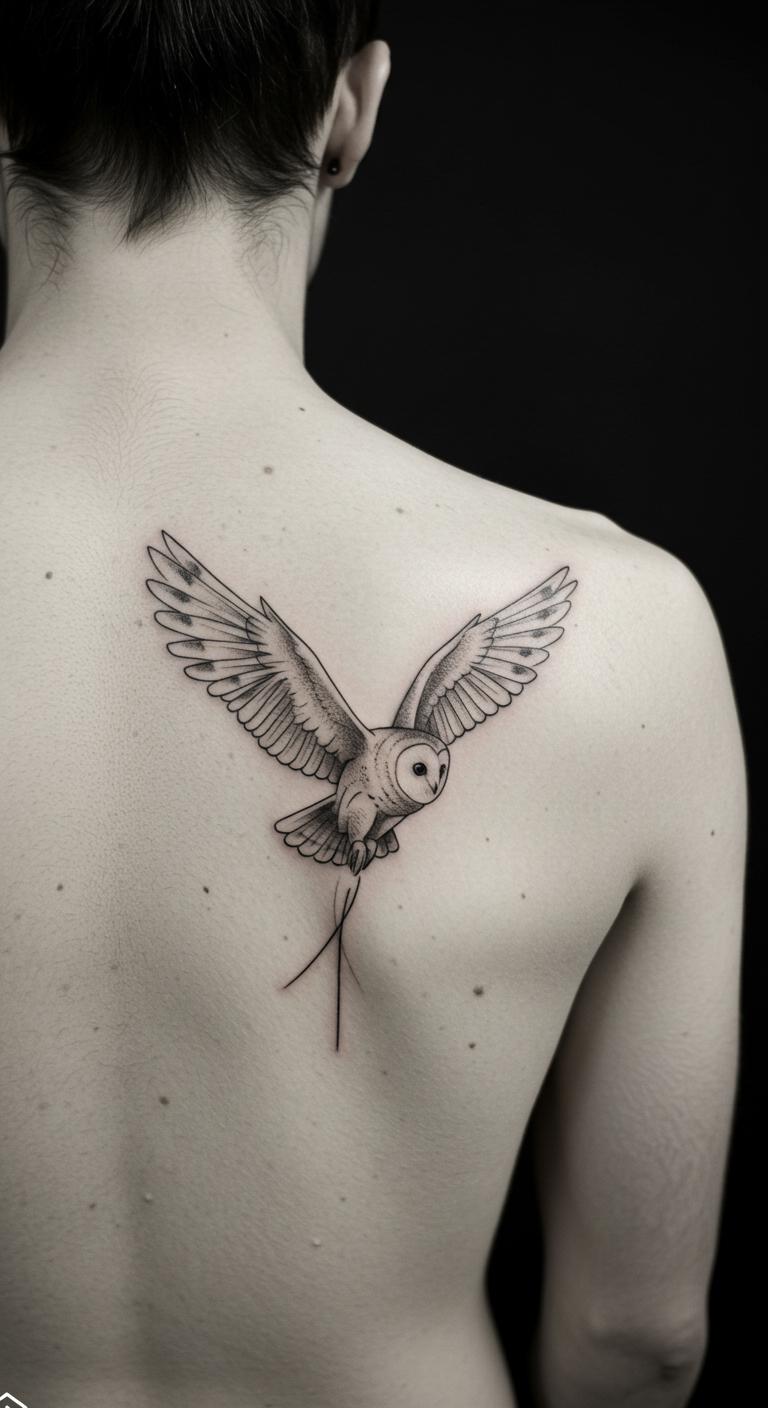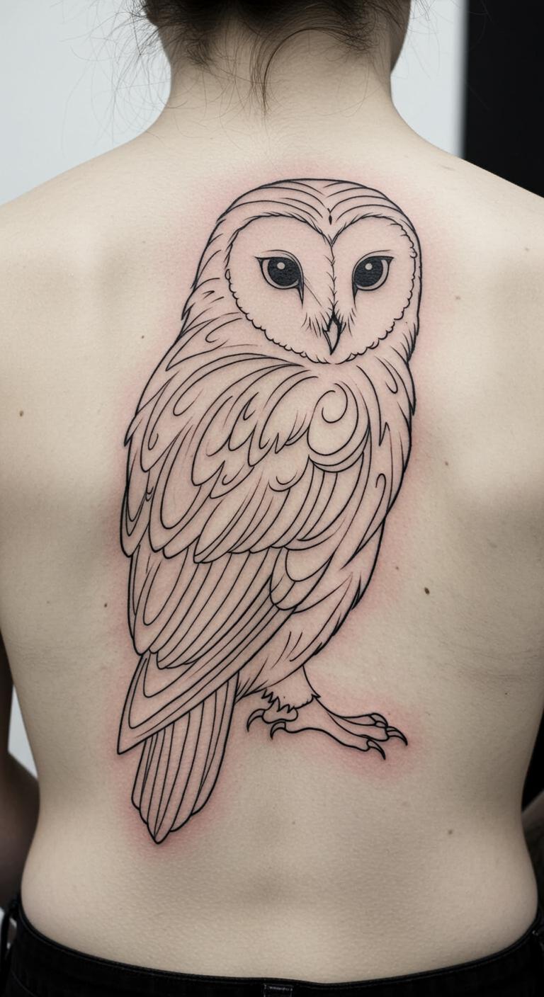 A back owl design spreads across for grandeur. This area allows for flow. Few lines create impact. Practice on large paper. Find back ideas free. Go to a budget studio. Outline only saves money. Choose a fitting size. Use standard care. Let it represent your path. Add elements from home art. It’s expansive and personal.