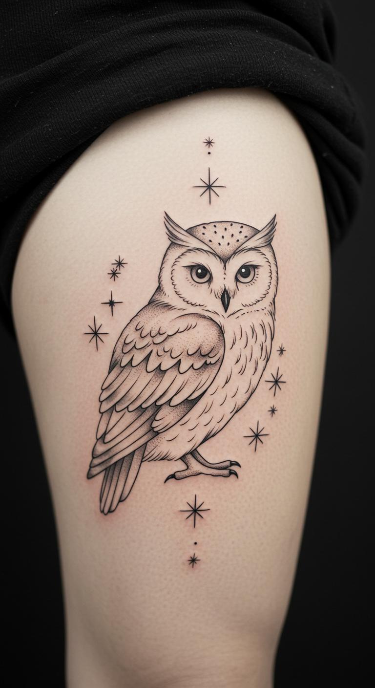 Stars around your owl add cosmic flair. Put it on your thigh for space. Simple dots for stars work. Draw stars and owls together. Use night sky pics. Select an affordable option. Limit stars for cost. Small scale helps. Care with regular products. This design sparks wonder. Customize stars in sketches. It’s magical and fun.