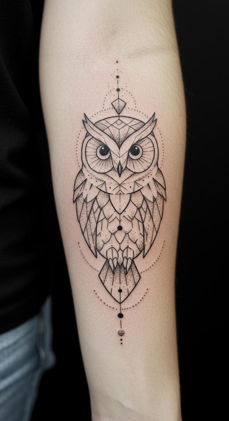Geometric owls turn the bird into modern art with triangles and squares. It creates a structured, cool vibe on your forearm. This style mixes sharp angles with the owl’s form for a fresh twist. Draw it at home using graph paper and a ruler for practice. Find free online templates to trace. Choose an affordable artist who does geometric styles to cut costs. Stick to basic black lines for simplicity and savings. Size it small if you’re watching your budget. It tattoos quickly, so fewer sessions mean less money spent. Care for it with everyday items like unscented soap. Let this design represent your logical side. Add a personal touch, like an extra shape, to make it yours.