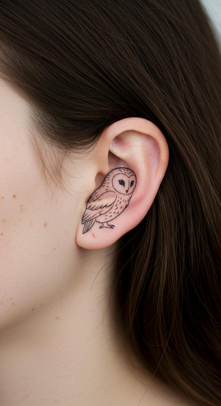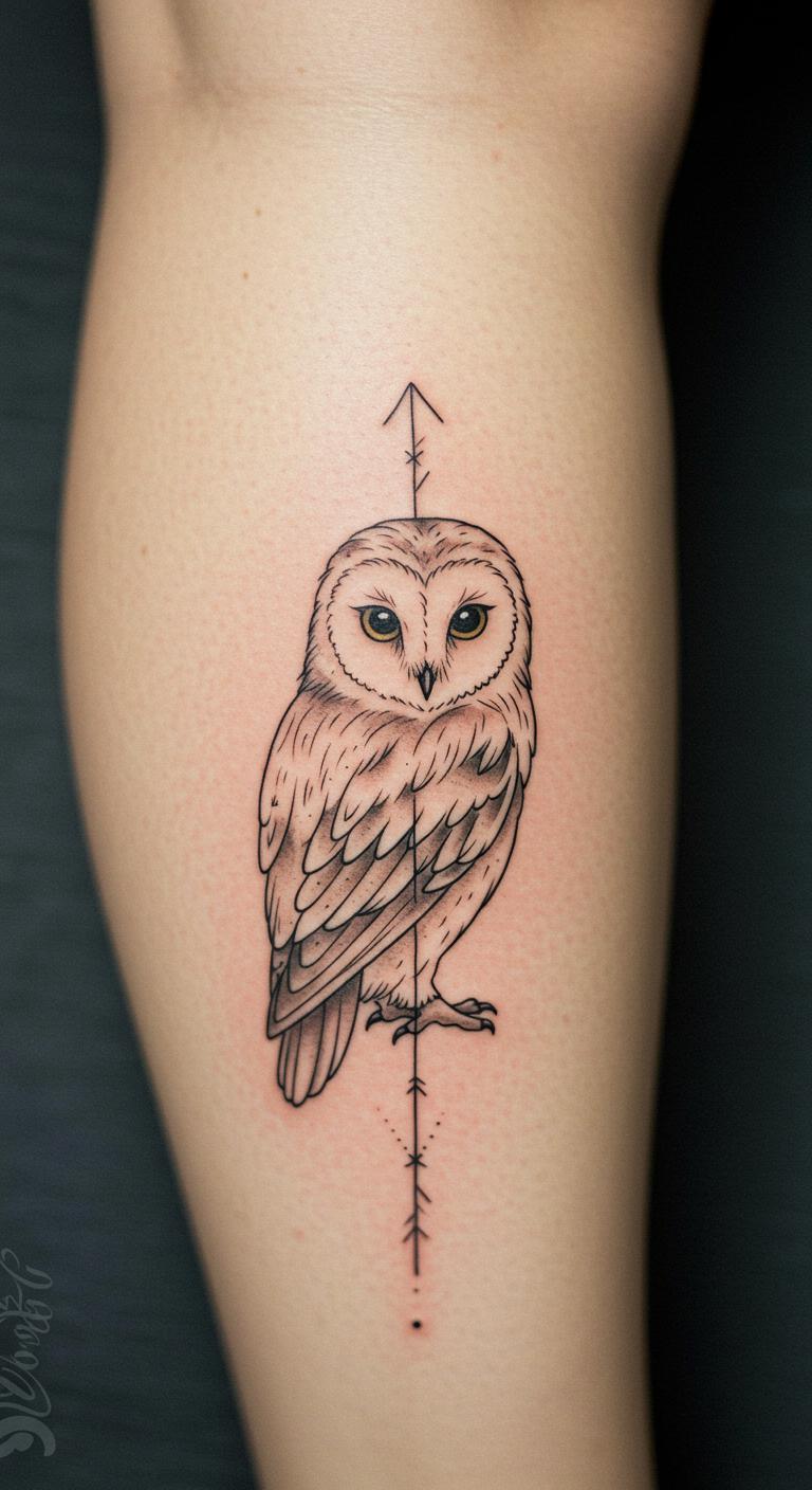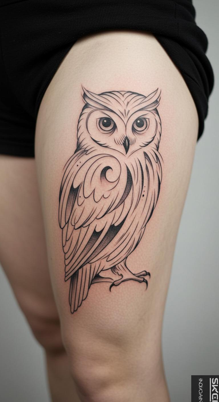 Go abstract with an owl made of flowing curves and shapes. Put it on your thigh for a private spot. This version plays with form, keeping things artistic and simple. Draw freehand at home to experiment. Use old magazines for shape ideas. Choose a nearby shop for affordable rates. Opt for thin lines to save on ink. Size it modestly to fit your budget. Care involves basic routines like gentle washing. Use this tattoo to express your creative side. Add a twist, like a wavy line, based on your drawing. It’s versatile for different clothing styles.