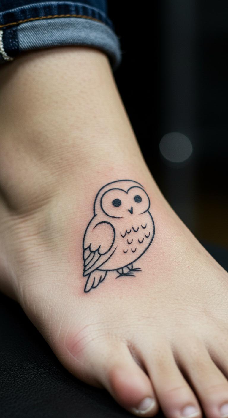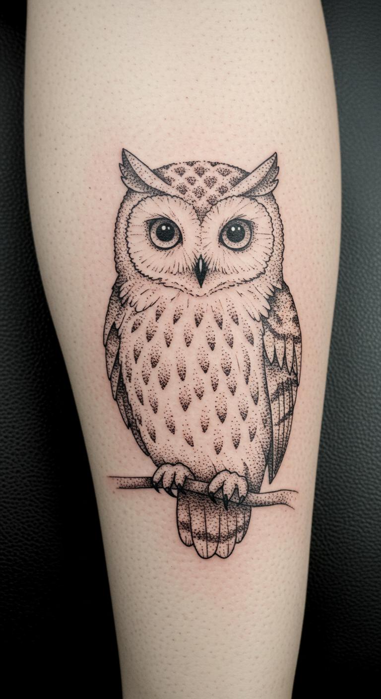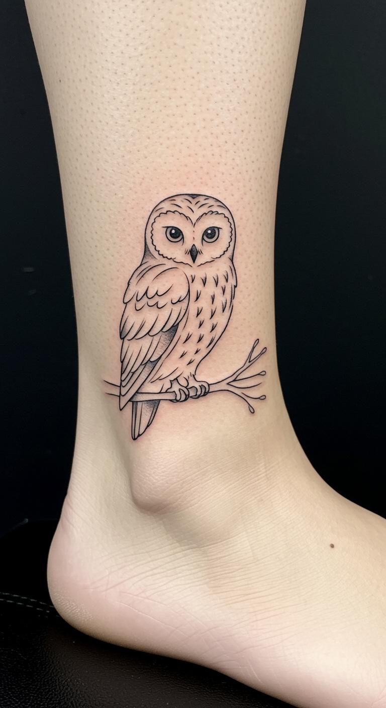 Perch your owl on a branch for a grounded feel. Place it on your ankle for a subtle touch. This design adds a natural element with just a few lines. Practice drawing it on paper with everyday pens. Look for inspiration in nature photos online. Find an artist who charges by the hour to stay budget-friendly. Use single-color ink to minimize costs. Keep it tiny for quick, cheap sessions. After tattooing, protect it with household lotion. Let it symbolize stability in your routine. Make it unique by adding a leaf detail yourself in your sketch. This style hides well under socks, perfect for work.